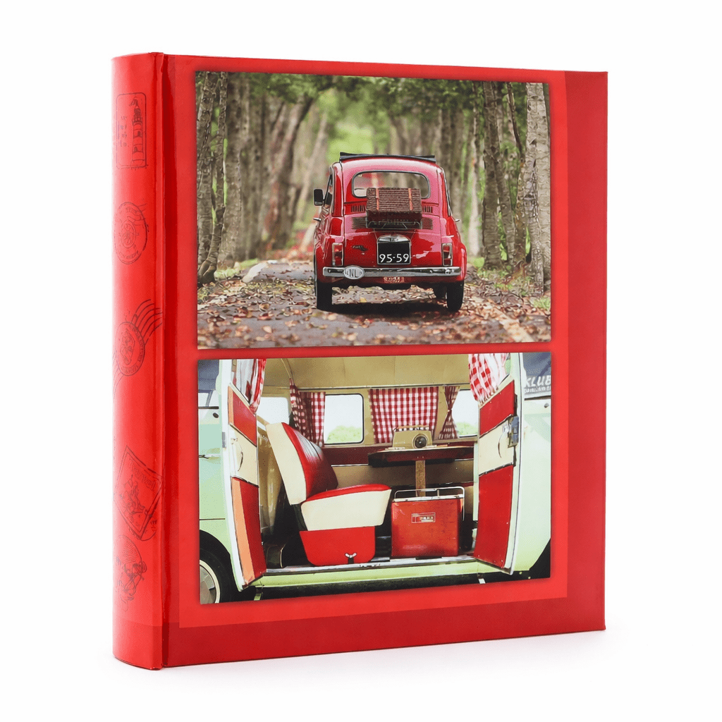 Výrazný červený obal s retro cestovateľským motívom pôsobí štýlovo a dodáva albumu osobitý charakter. Vďaka tomu sa hodí nielen na archiváciu fotografií, ale aj ako pekný doplnok do interiéru alebo darček pre blízkeho.