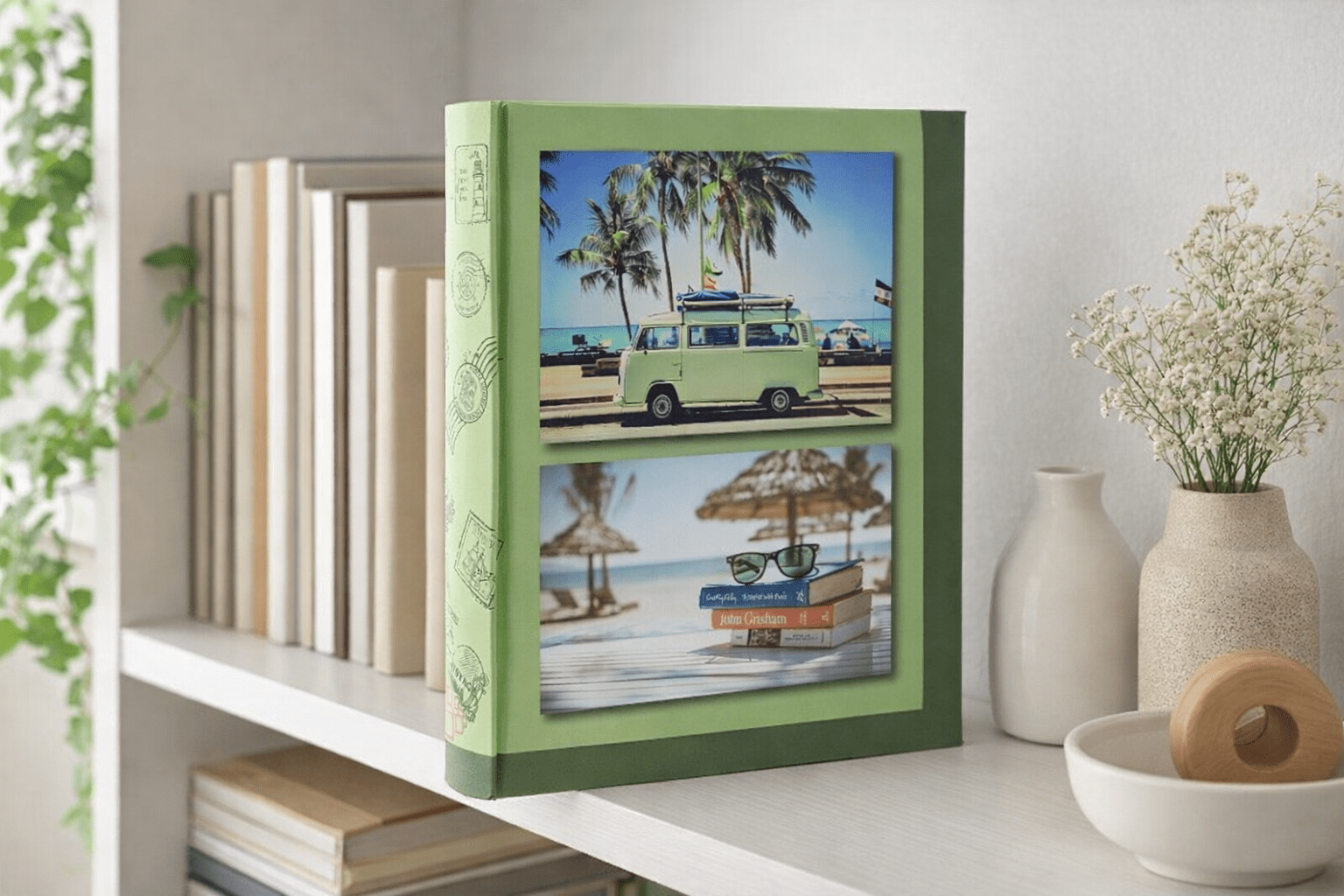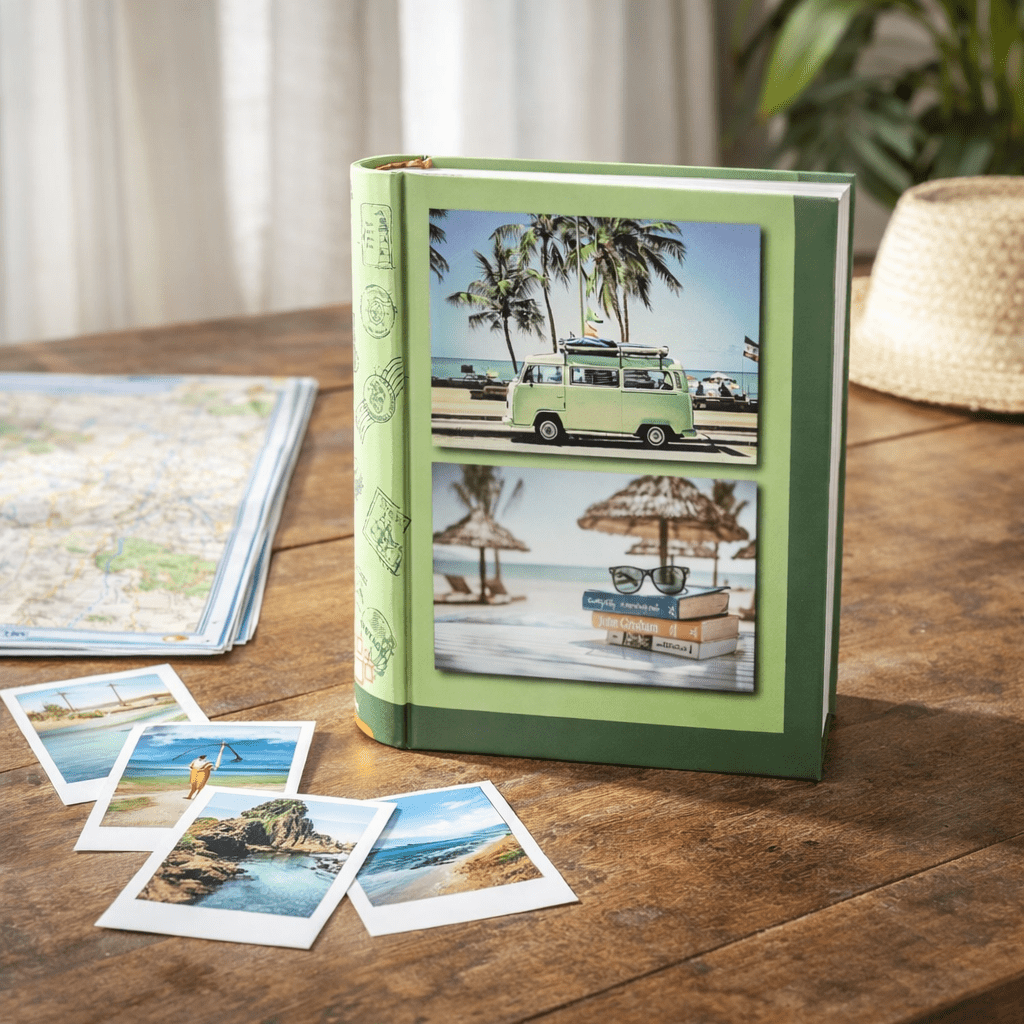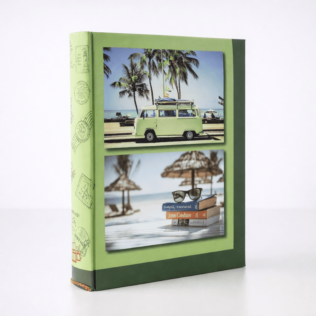 Cestovateľský fotoalbum Outing je praktický album na uchovanie fotografií vo formáte 10 × 15 cm. Ponúka miesto až pre 200 snímok a vďaka zasúvaciemu systému sa fotografie zakladajú jednoducho a prehľadne. Retro zelené vyhotovenie s motívom cestovania pôsobí príjemne a hodí sa najmä na dovolenkové, výletné aj rodinné spomienky.