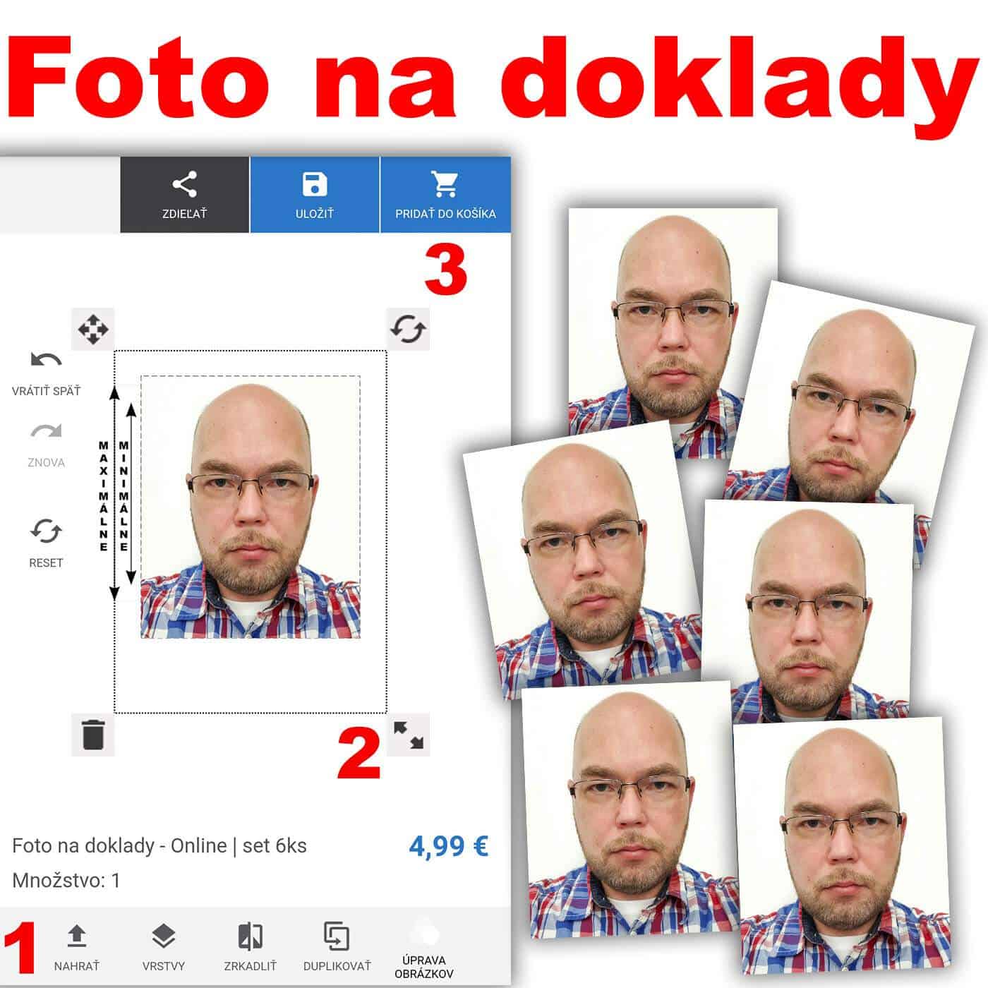 Odfoťte sa na svetlom pozadí pri dostatočnom osvetlení. Bez porývky hlavy, bez farebných okuliarov. Zdroj svetla nech je pred vami. Vložte Vašu fotografiu do našeho systému. Kliknite na prispôsobenie. 1. Nahrajte vašu fotku. 2. Prispôsobte veľkosť. 3. Pridajte do košíka. Objednanú fotografiu Vám profesionálne upravíme pre čo najlepší výsledok.
