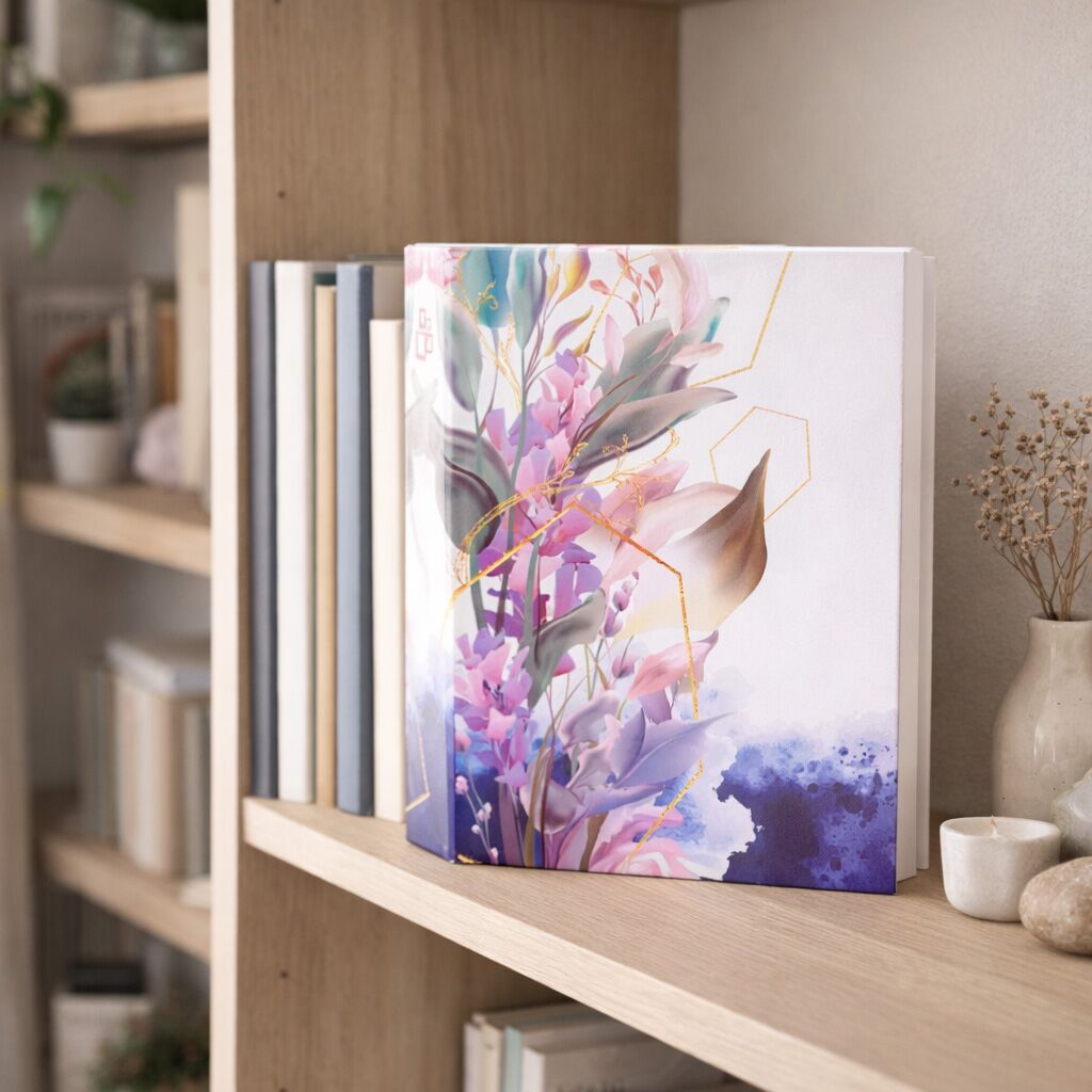 Obal albumu zdobí jemný abstraktný kvetinový motív v pastelových farbách s dekoratívnymi zlatými líniami. Album preto pôsobí dekoratívne a môže byť zároveň pekným doplnkom v knižnici, na polici alebo na stole.