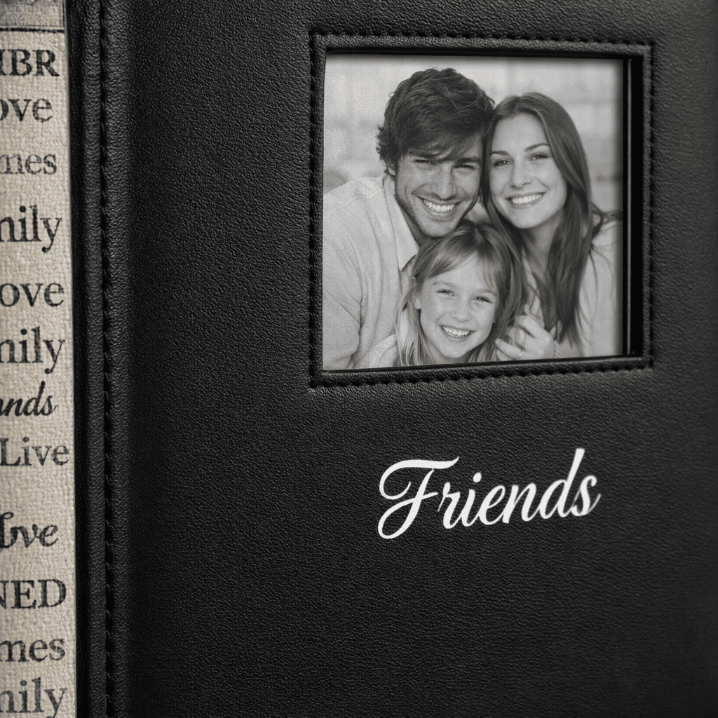 Vďaka kombinácii jednoduchého tmavého dizajnu a jemného textového motívu pôsobí album moderne a zároveň nadčasovo. Na prednej strane sa nachádza aj okienko na vloženie vlastnej fotografie, čo dodáva albumu osobný charakter.