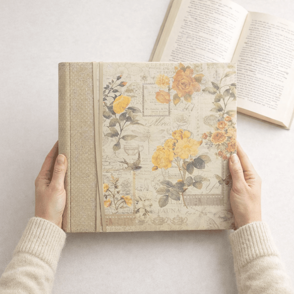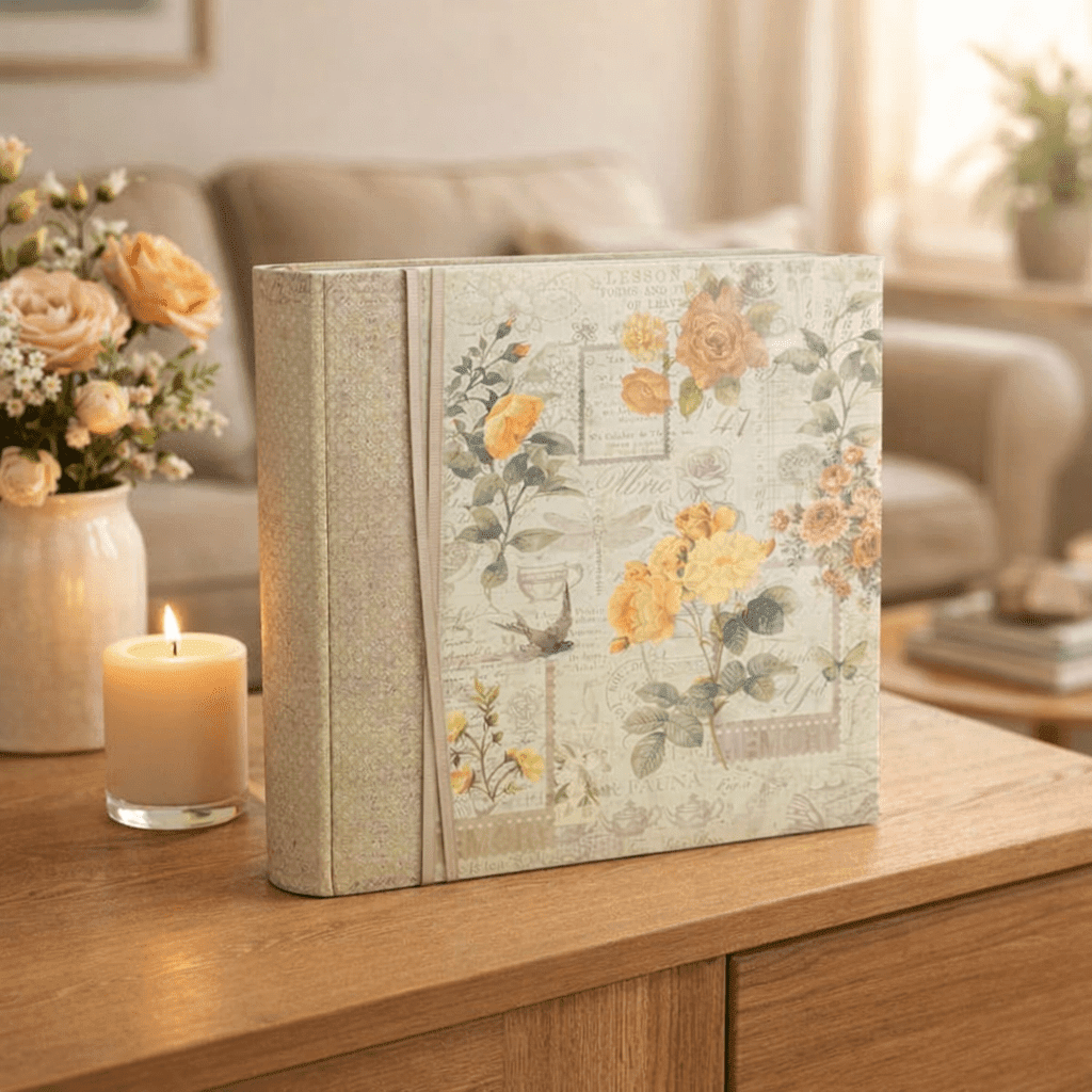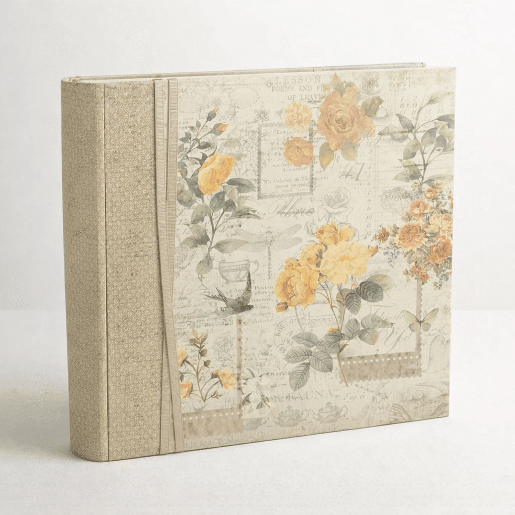 Fotoalbum Ophelia zaujme na prvý pohľad svojím jemným kvetinovým dizajnom v vintage štýle. Kombinácia prírodných tónov, ilustrácií kvetov a dekoratívnych prvkov pôsobí pokojne a esteticky, vďaka čomu sa album hodí nielen na uchovanie fotografií, ale aj ako doplnok do interiéru.