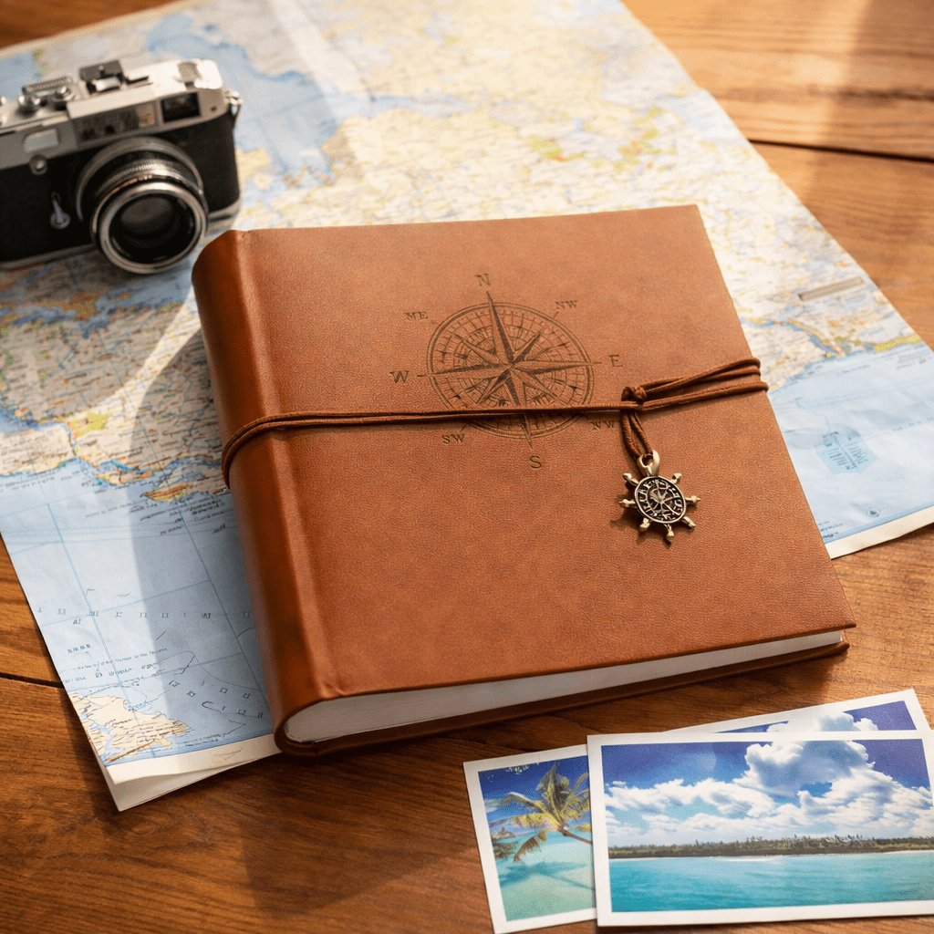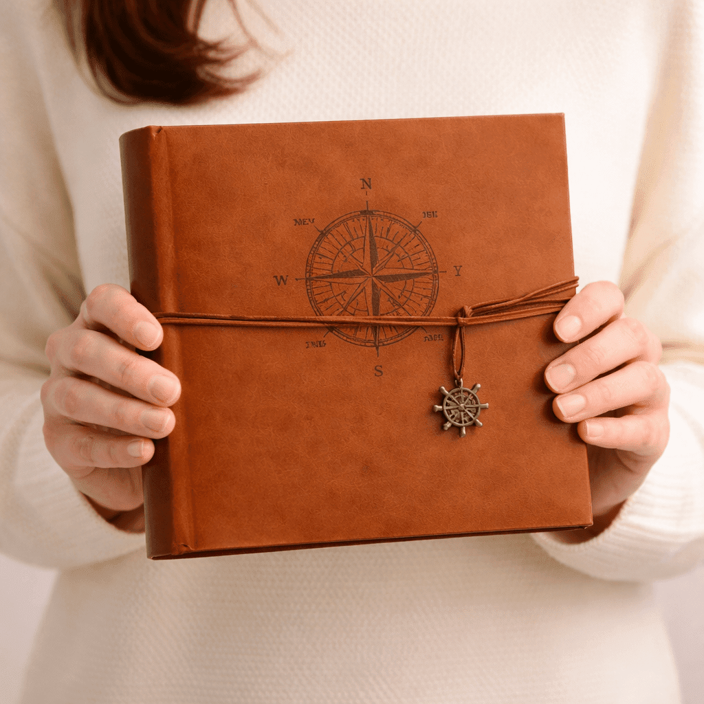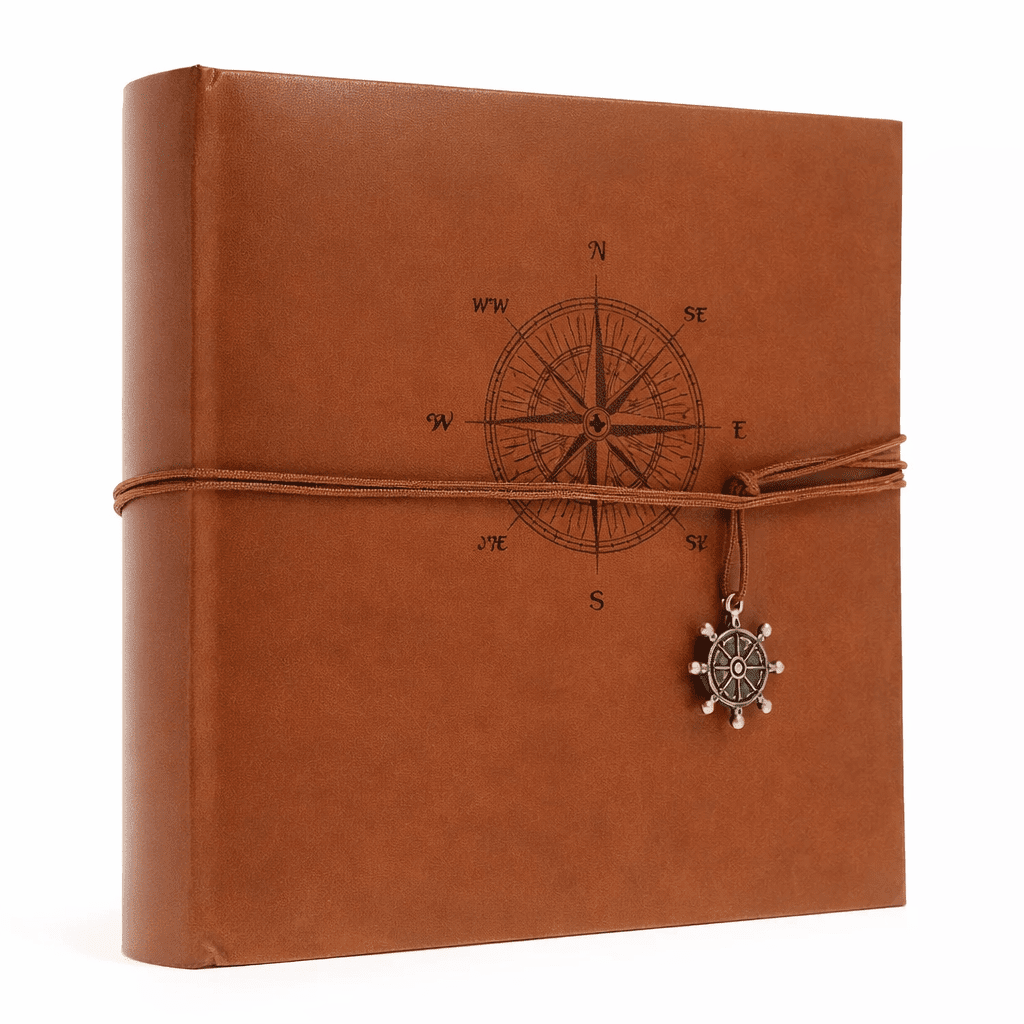 Obal albumu pôsobí elegantne a zároveň tematicky – zdobí ho motív kompasu, ktorý spolu so šnúrkou a kovovým príveskom vytvára jemný cestovateľský charakter. Album tak nepôsobí len ako úložisko fotografií, ale aj ako pekný doplnok do interiéru.