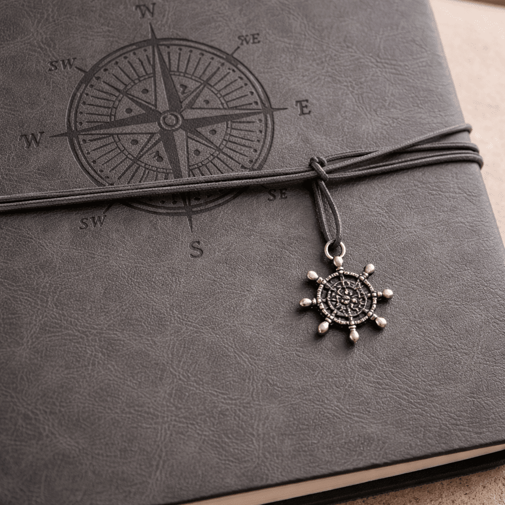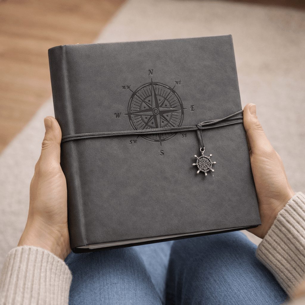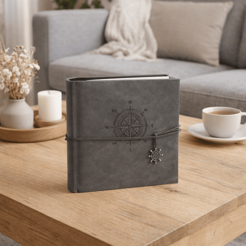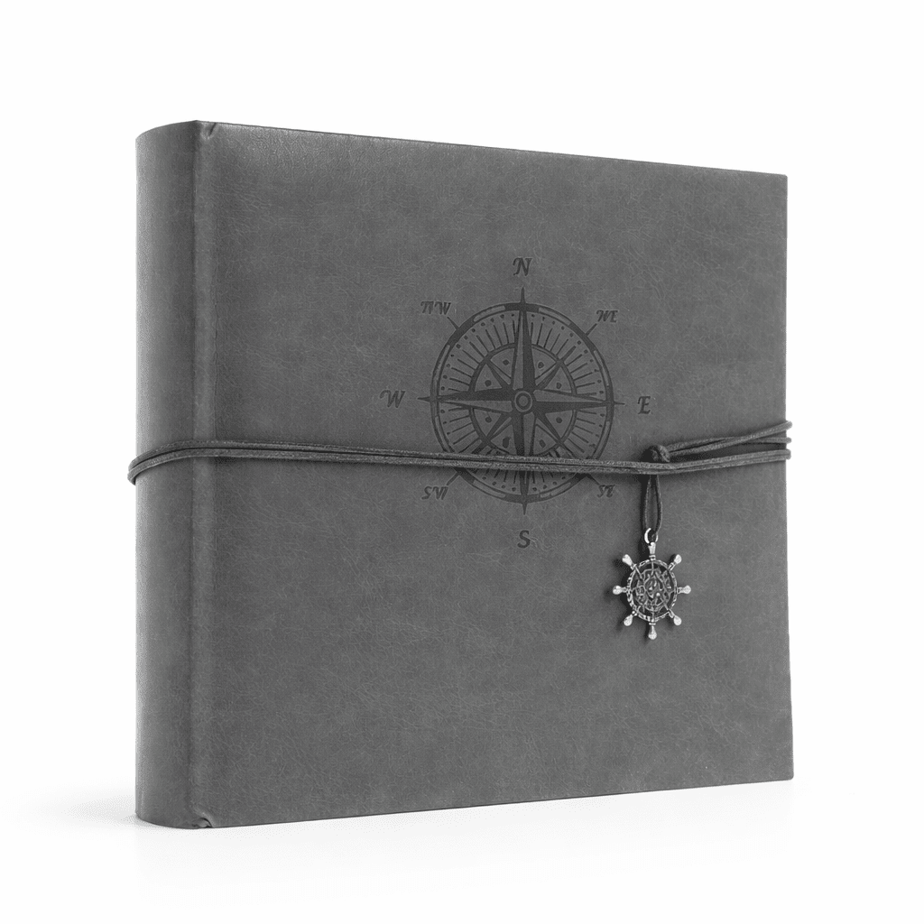 Jeho sivý obal s jemným motívom kompasu pôsobí pokojne a esteticky. Dekoratívne zatváranie na šnúrku s príveskom dodáva albumu originálny charakter a zároveň ho prakticky uzatvára.