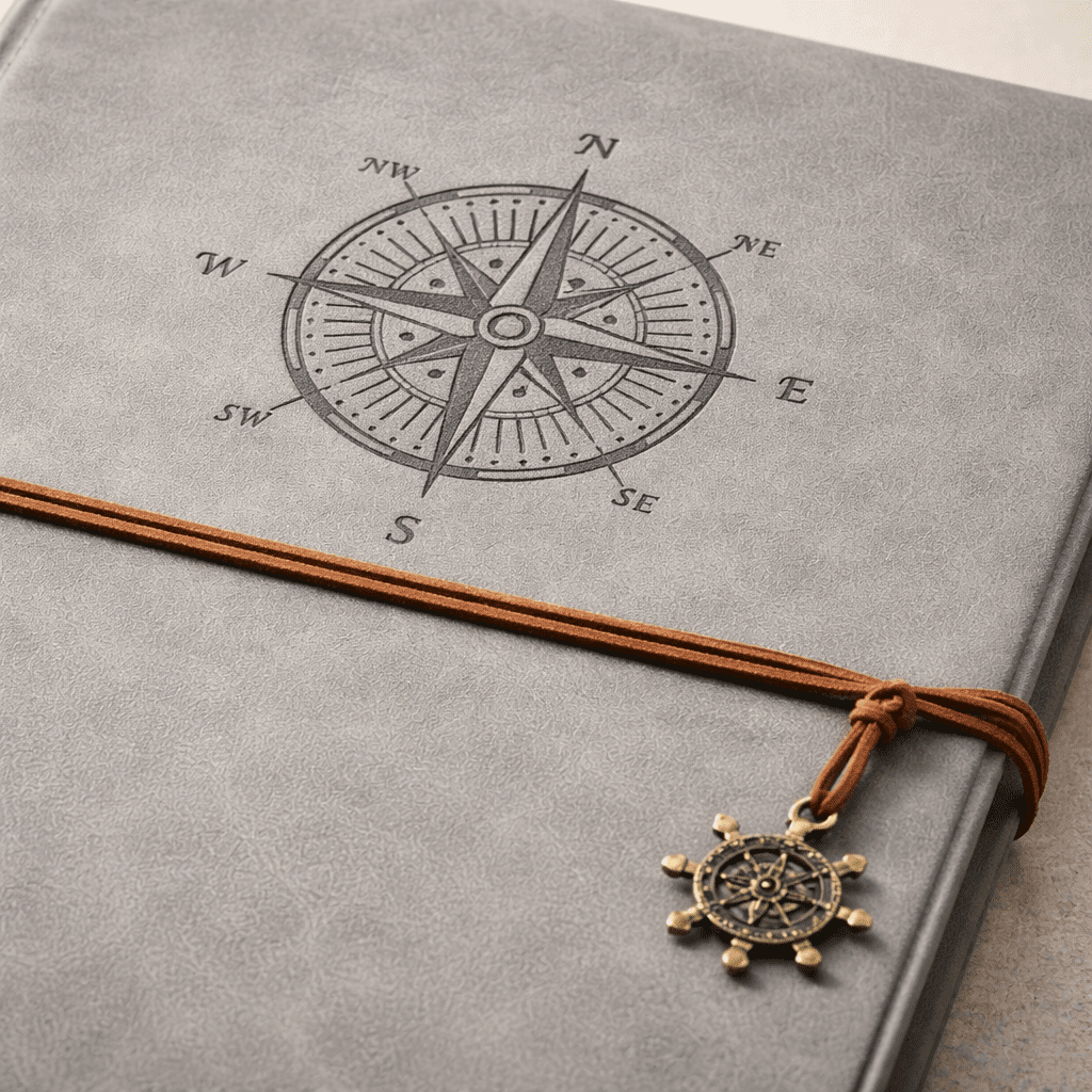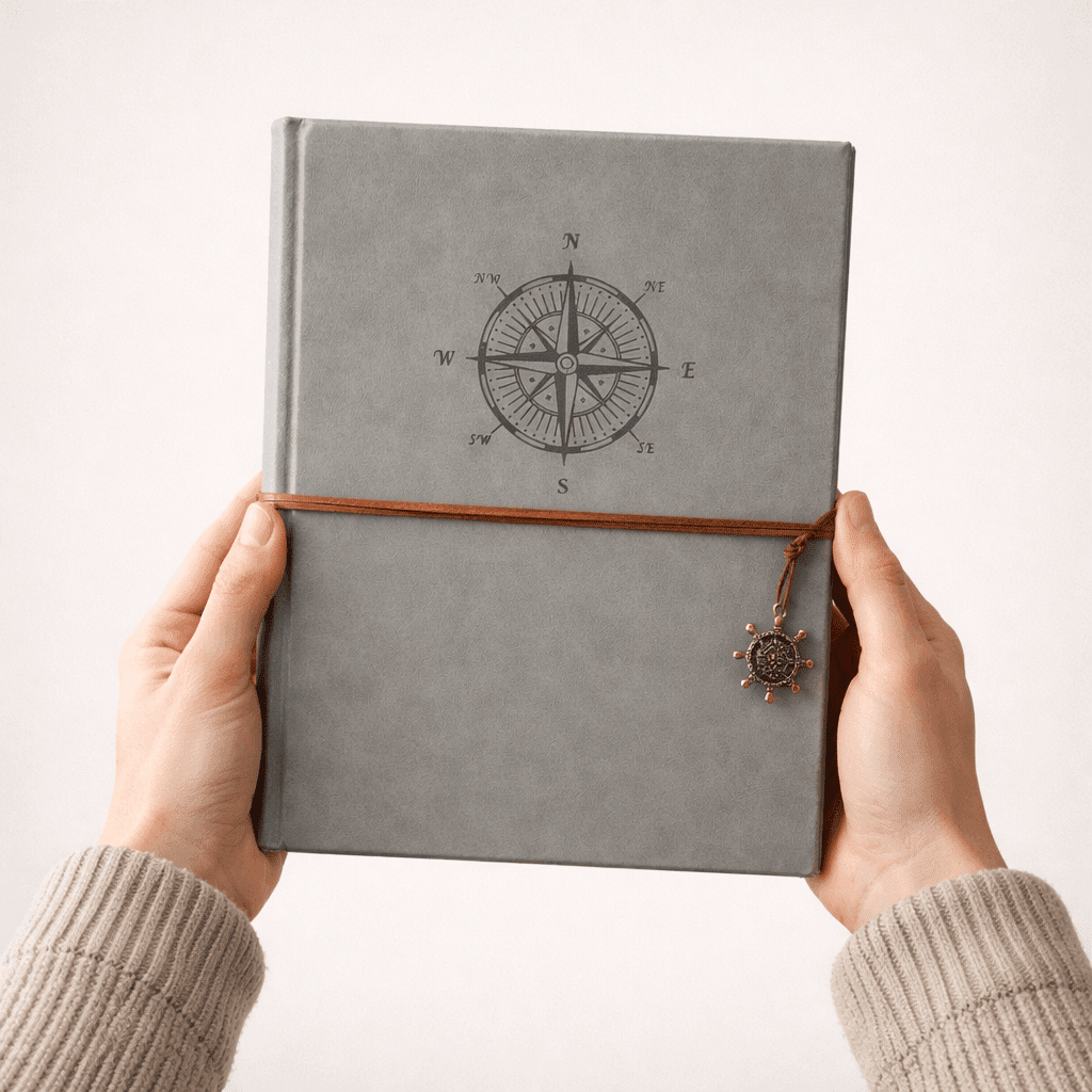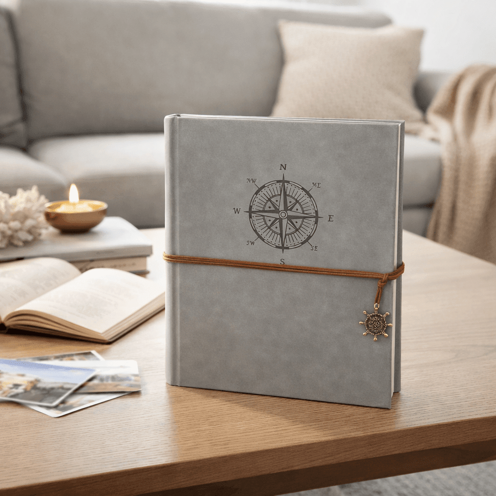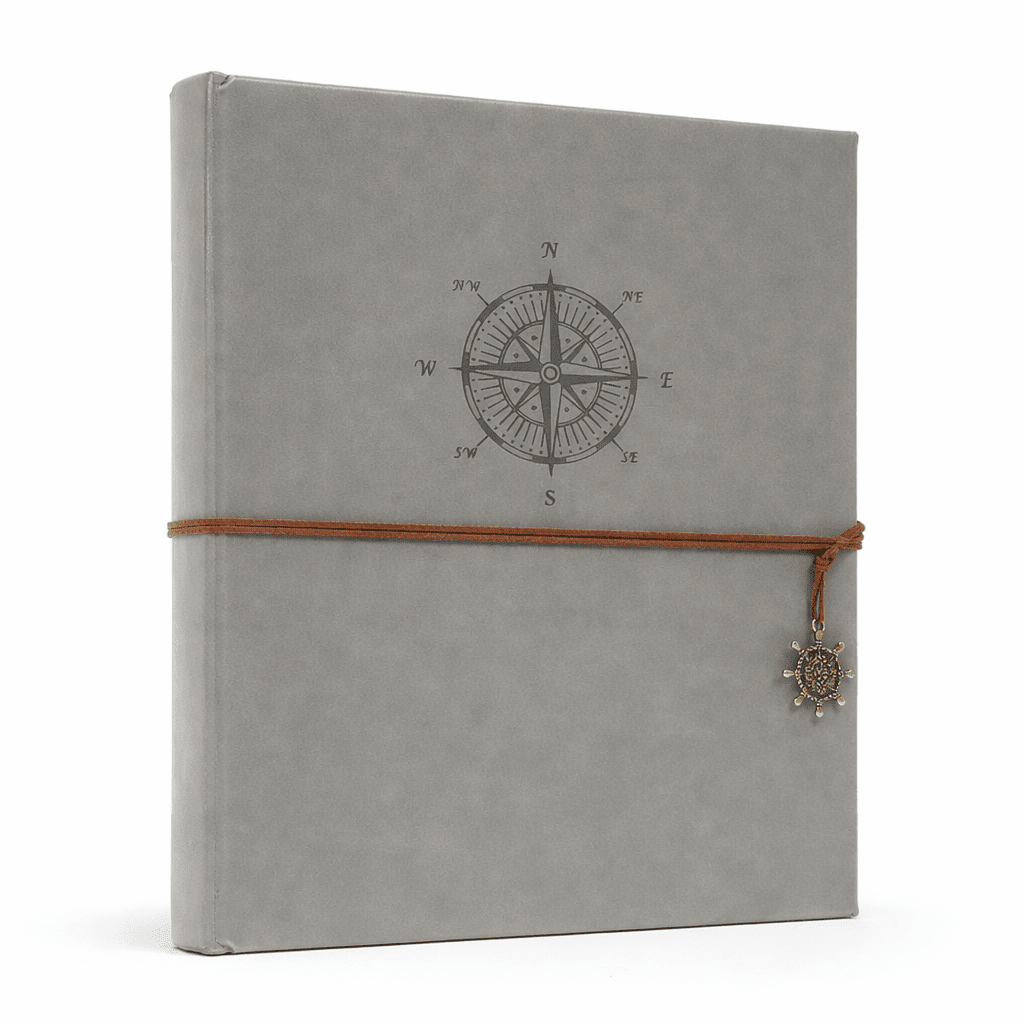 Obal v sivom prevedení s motívom kompasu pôsobí elegantne a zároveň tematicky ladí najmä s fotografiami z ciest. Zaujímavým detailom je šnúrkové uzatváranie s dekoratívnym príveskom, ktoré dodáva albumu osobitý charakter.