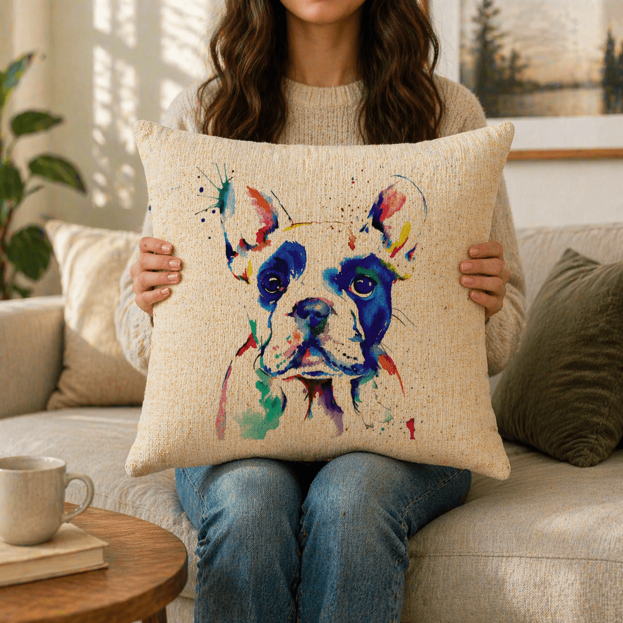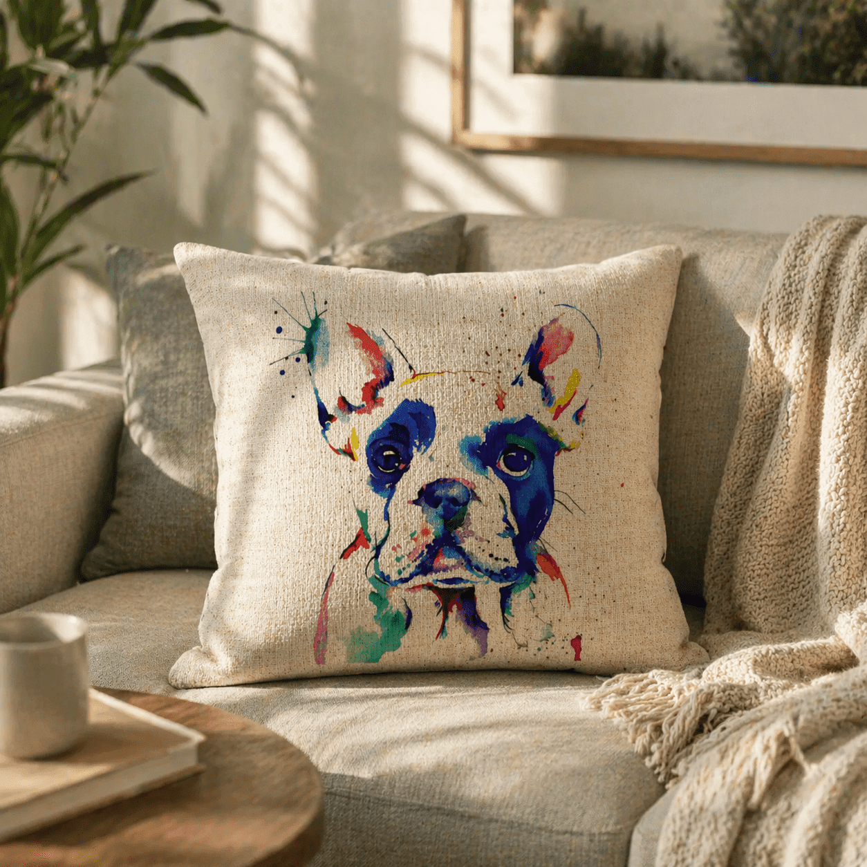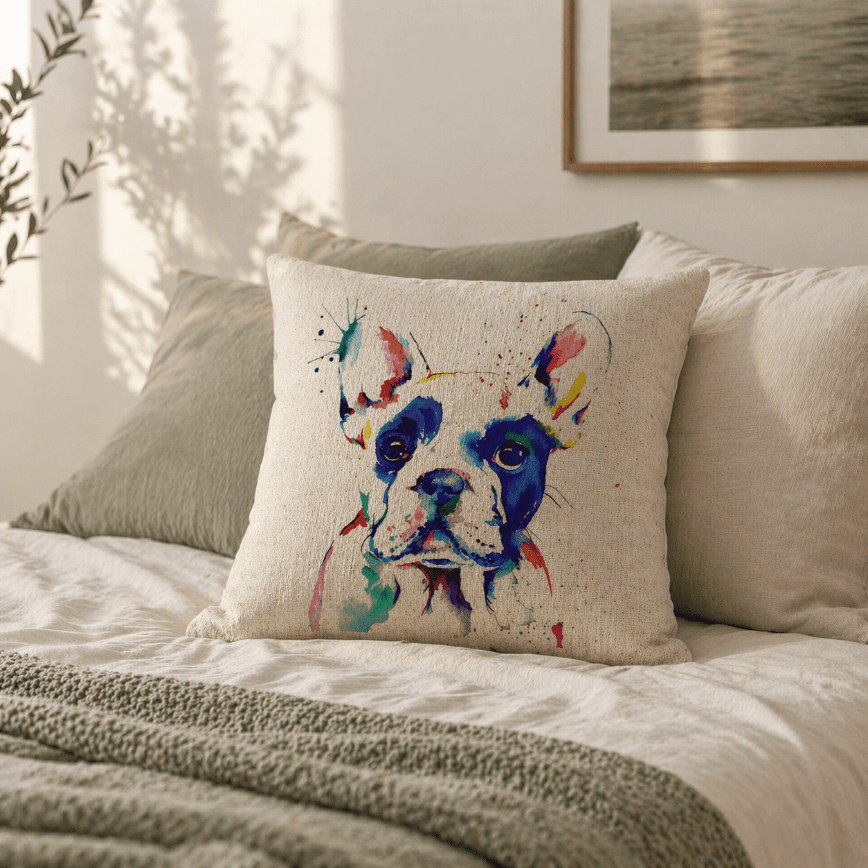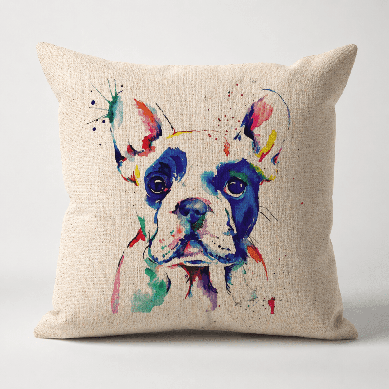 Dekoratívny vankúš s motívom francúzskeho buldočka v akvarelovom spracovaní pôsobí ako výrazný, no zároveň vkusný doplnok do interiéru. Farebná ilustrácia vynikne najmä na svetlom podklade s jemnou textúrou, ktorá pripomína prírodnú tkaninu.