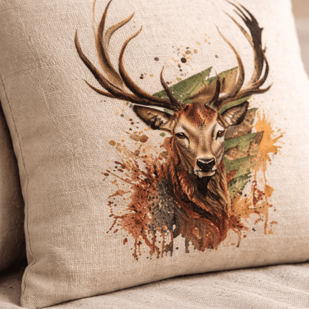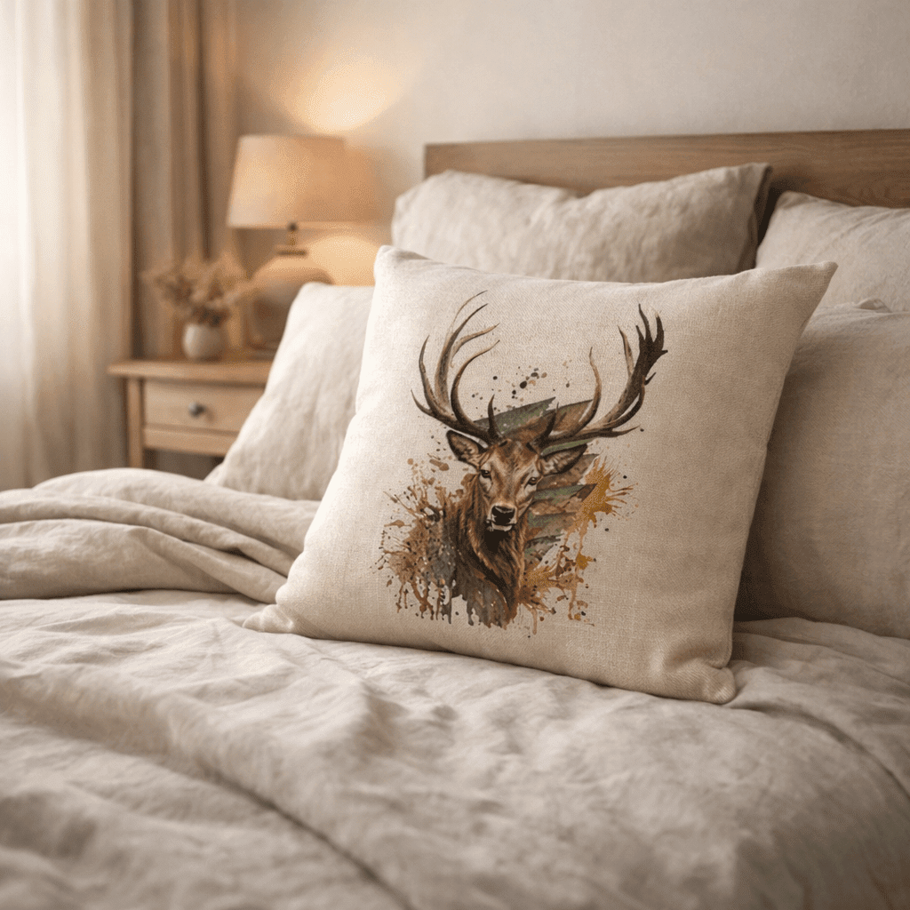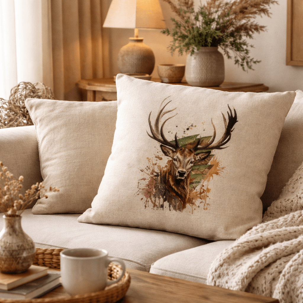 Dekoratívny vankúš s motívom hrdého jeleňa je zaujímavým doplnkom do interiéru, ktorý prirodzene pritiahne pozornosť. Kombinácia jemnej ľanovej textúry a výraznej potlače zvieraťa pôsobí harmonicky a zároveň dodáva priestoru osobitý charakter.
