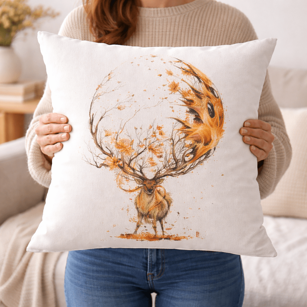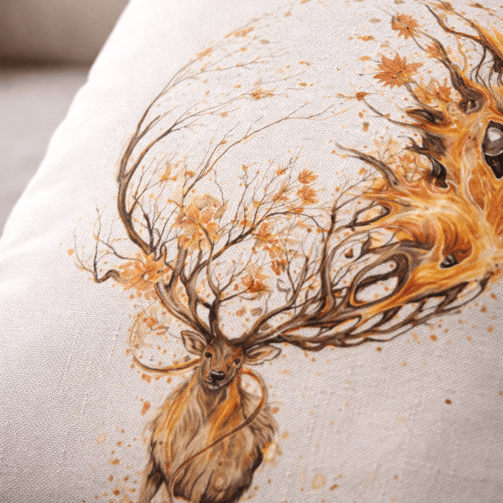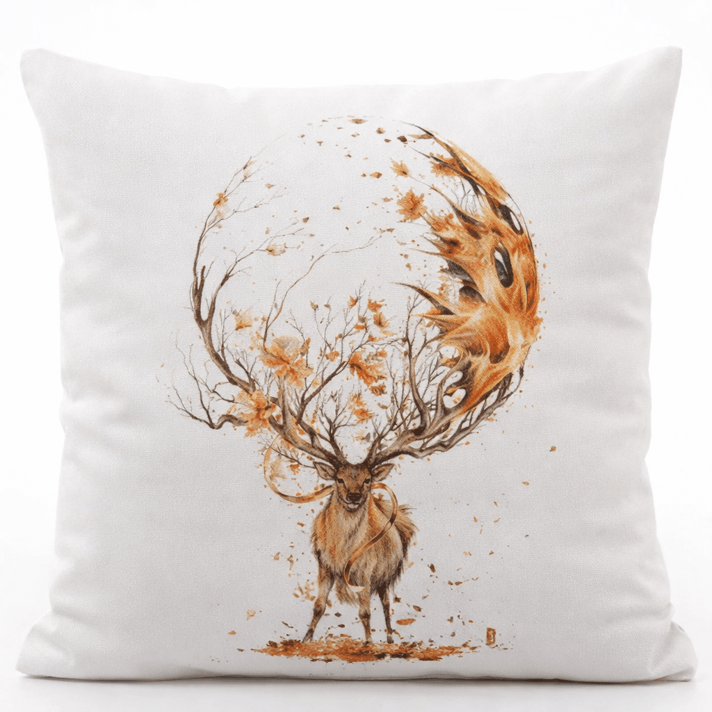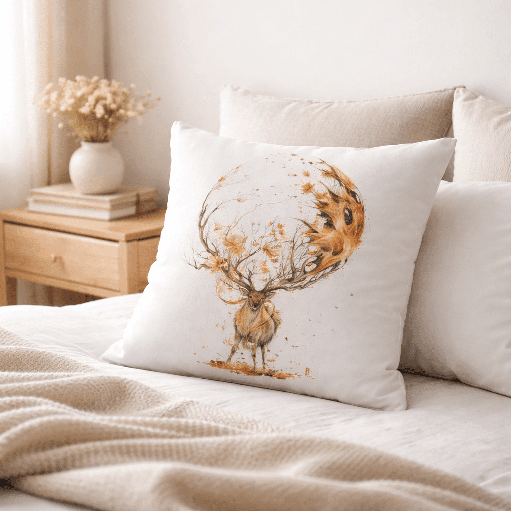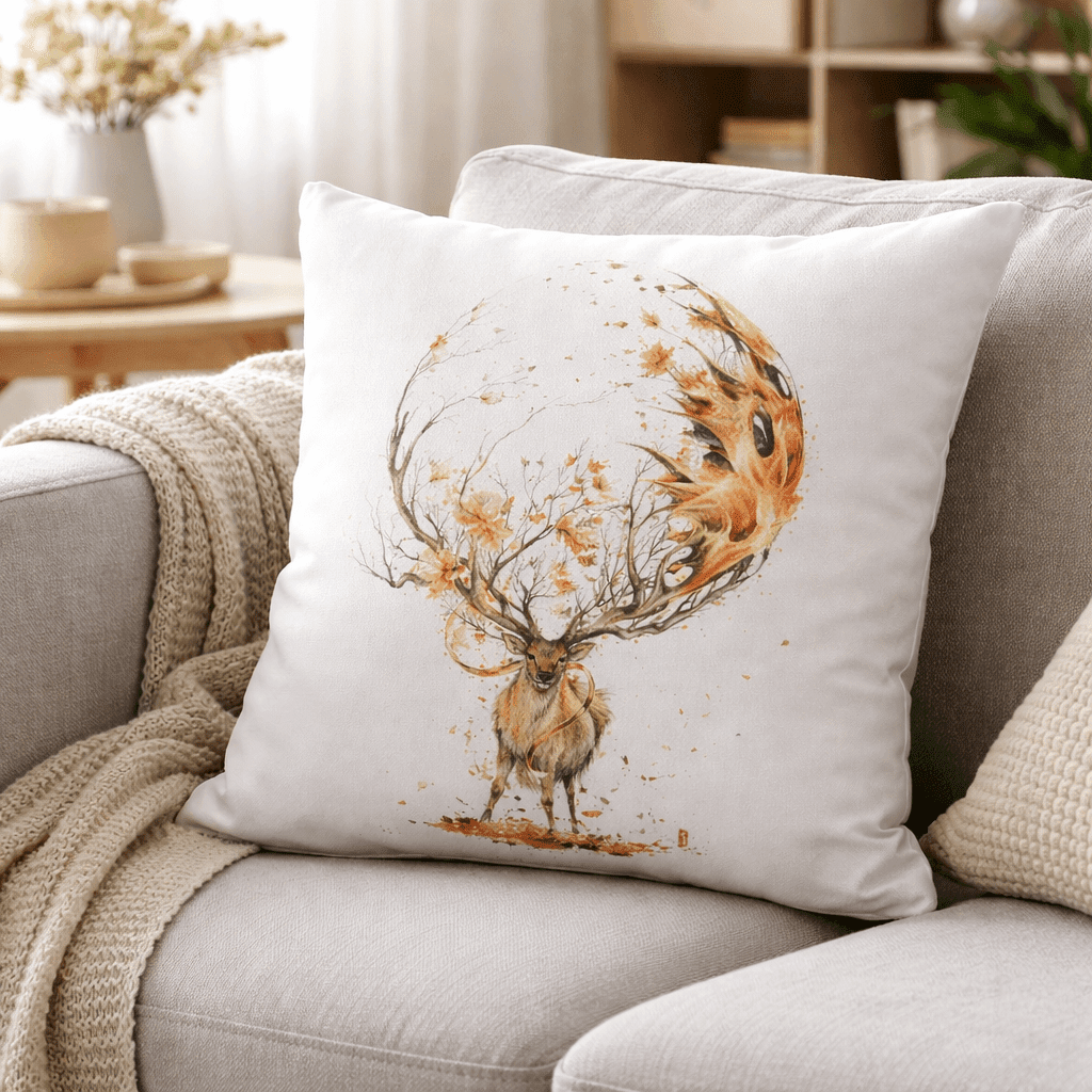 Dekoratívny vankúš s motívom jeleňa s ohňom predstavuje výrazný doplnok, ktorý dokáže oživiť každý interiér. Kombinácia bieleho podkladu a detailnej potlače vytvára kontrastný a vizuálne zaujímavý prvok na sedačke, posteli alebo kresle.
