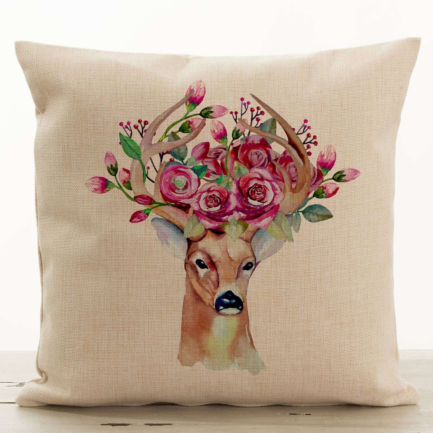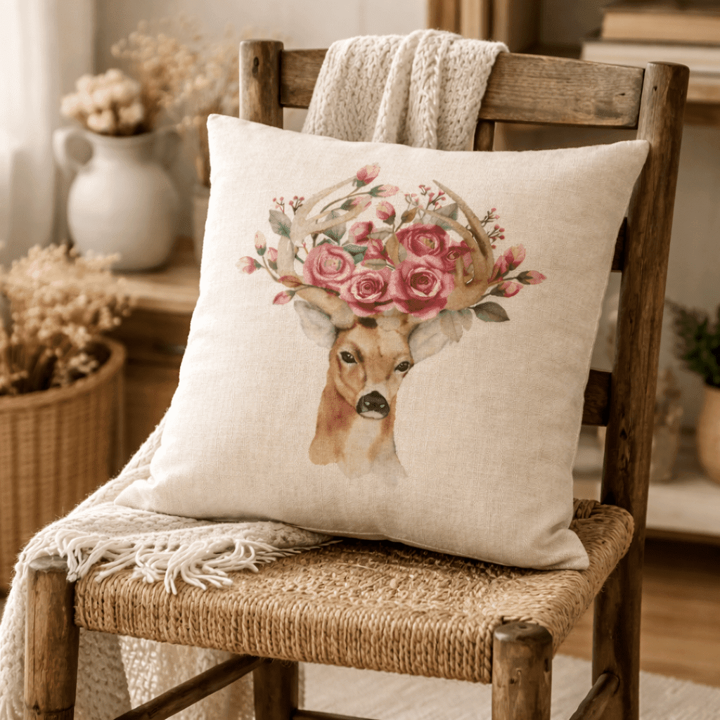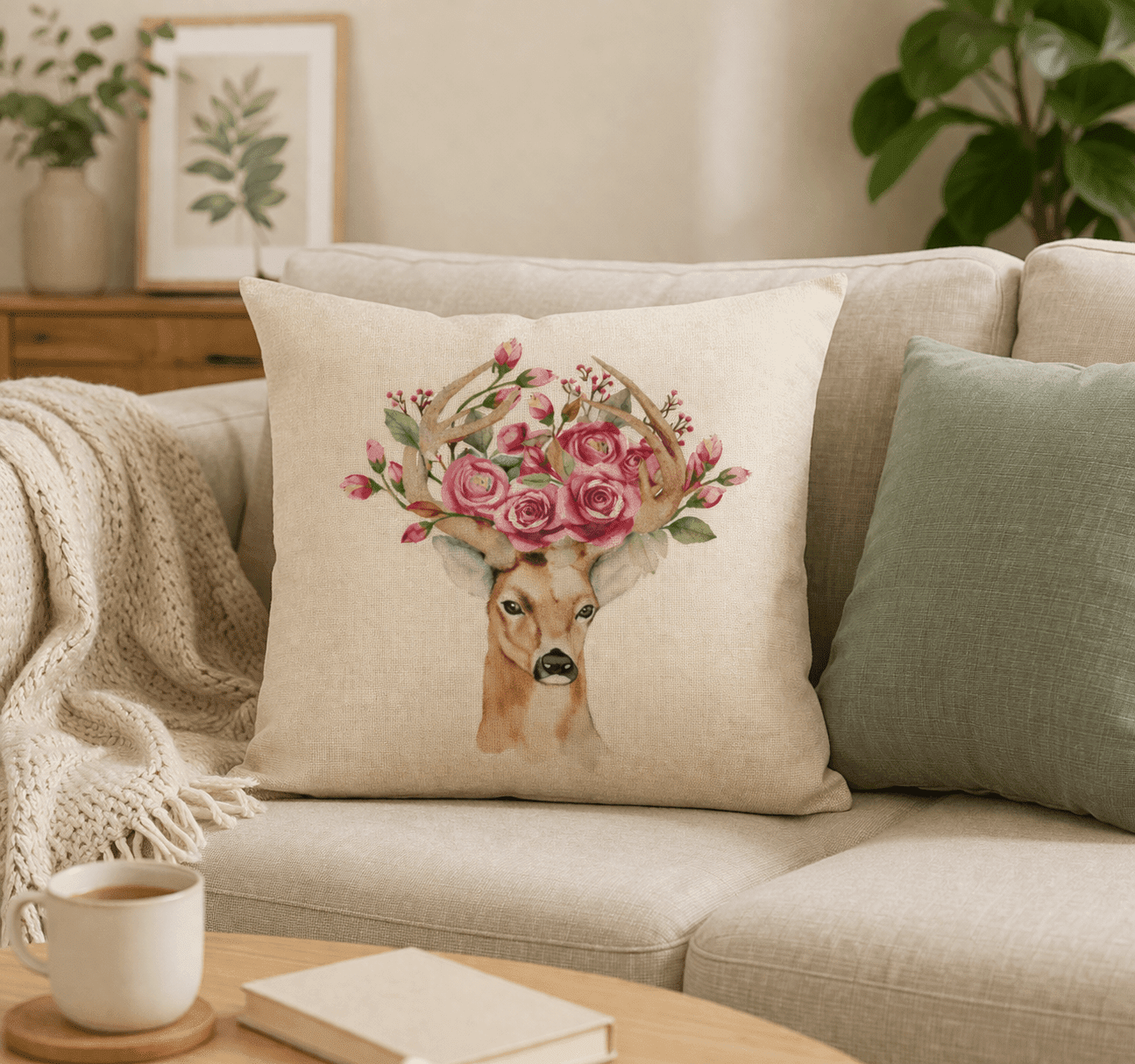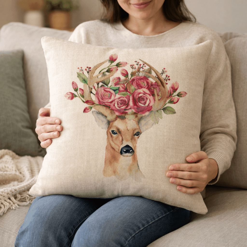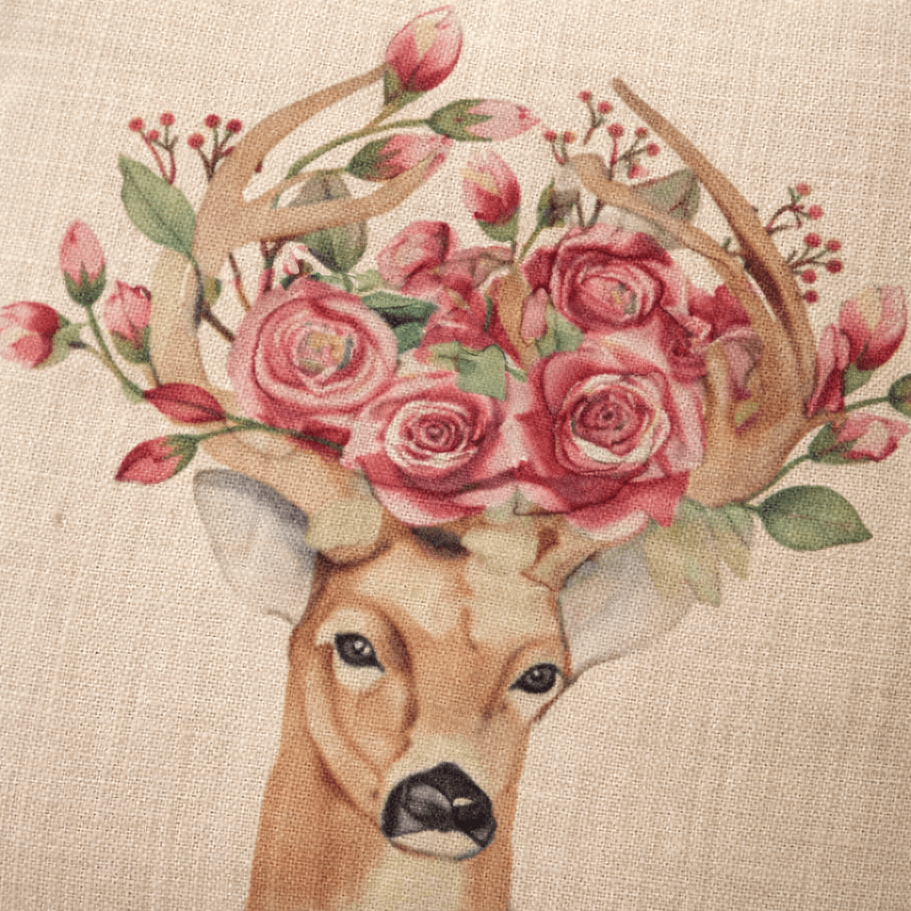 Dekoratívny vankúš s motívom jeleňa a ruží pôsobí pokojne a prirodzene. Kombinácia zvieracieho motívu s kvetinovými prvkami vytvára harmonický dizajn, ktorý sa ľahko začlení do rôznych typov interiéru.