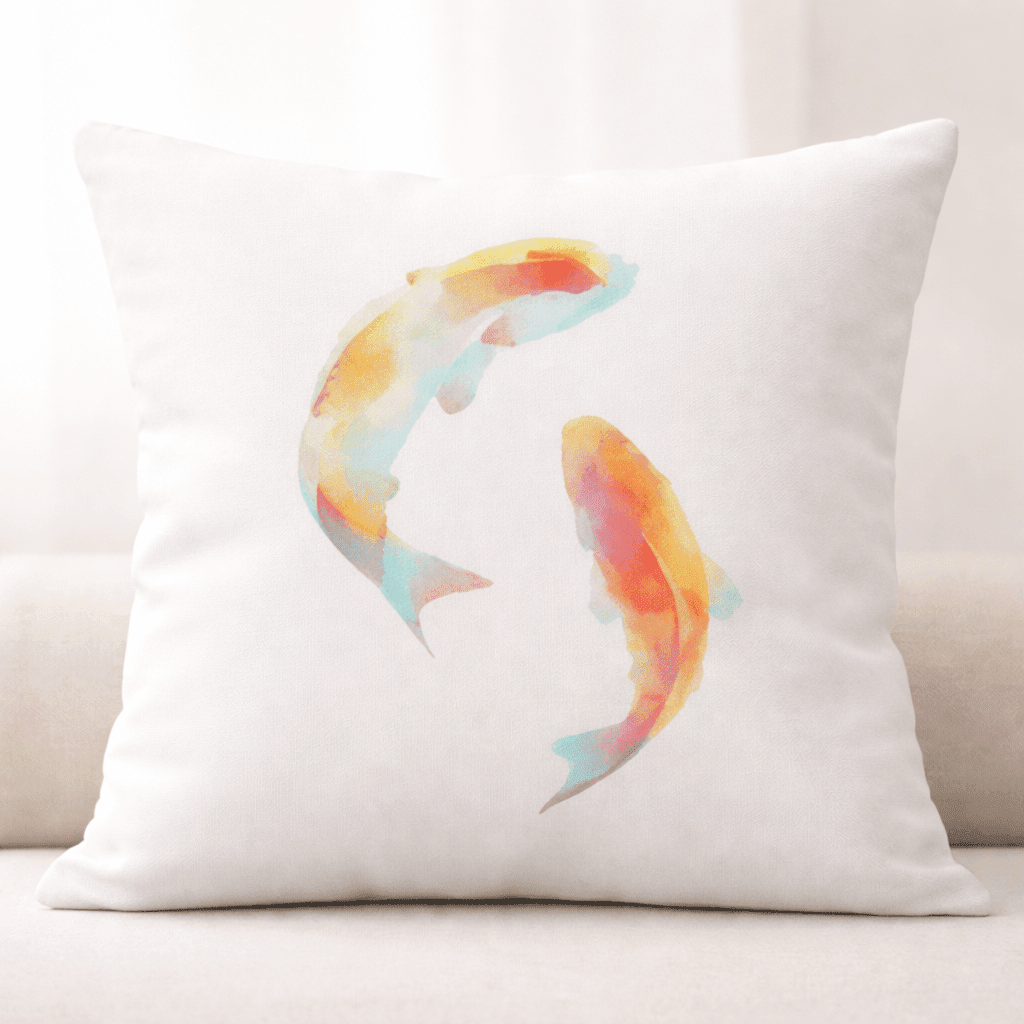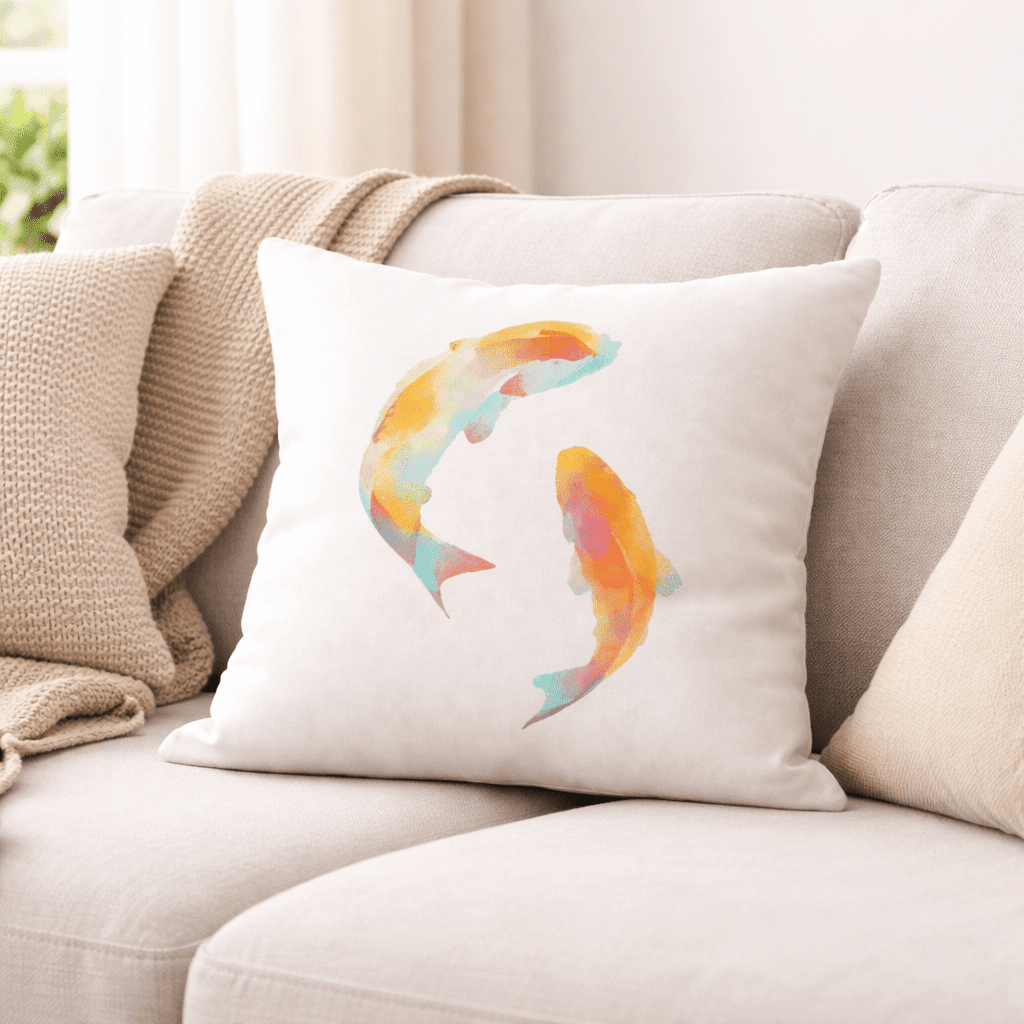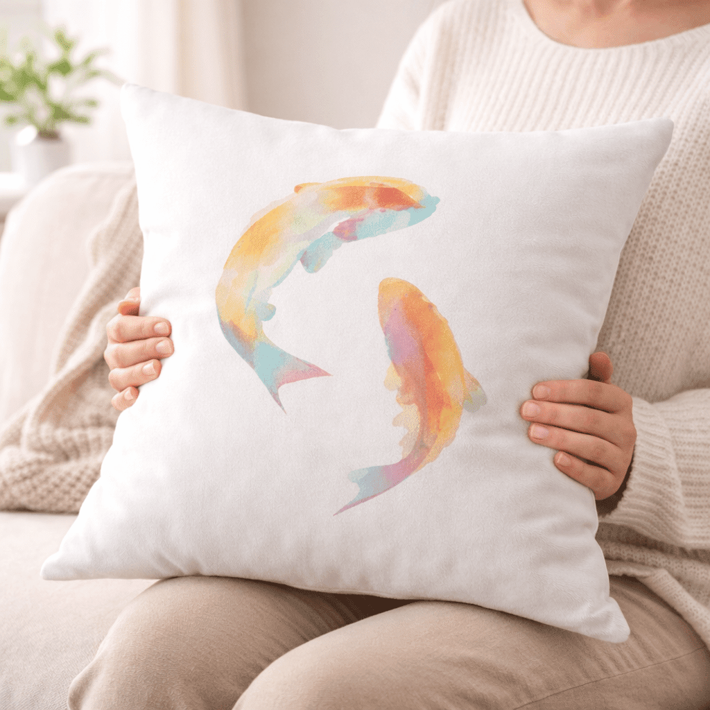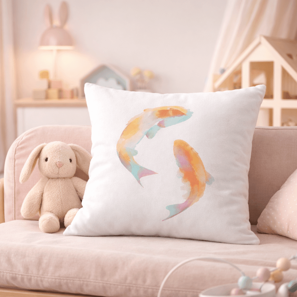 Dekoratívny vankúš s motívom maľovaných rybiek predstavuje jednoduchý a estetický doplnok do interiéru. Jemná farebná potlač na bielom podklade pôsobí pokojne a prirodzene, vďaka čomu sa ľahko kombinuje s rôznymi štýlmi zariadenia.