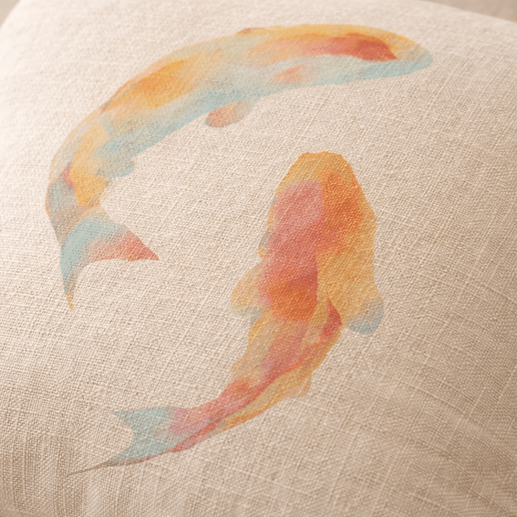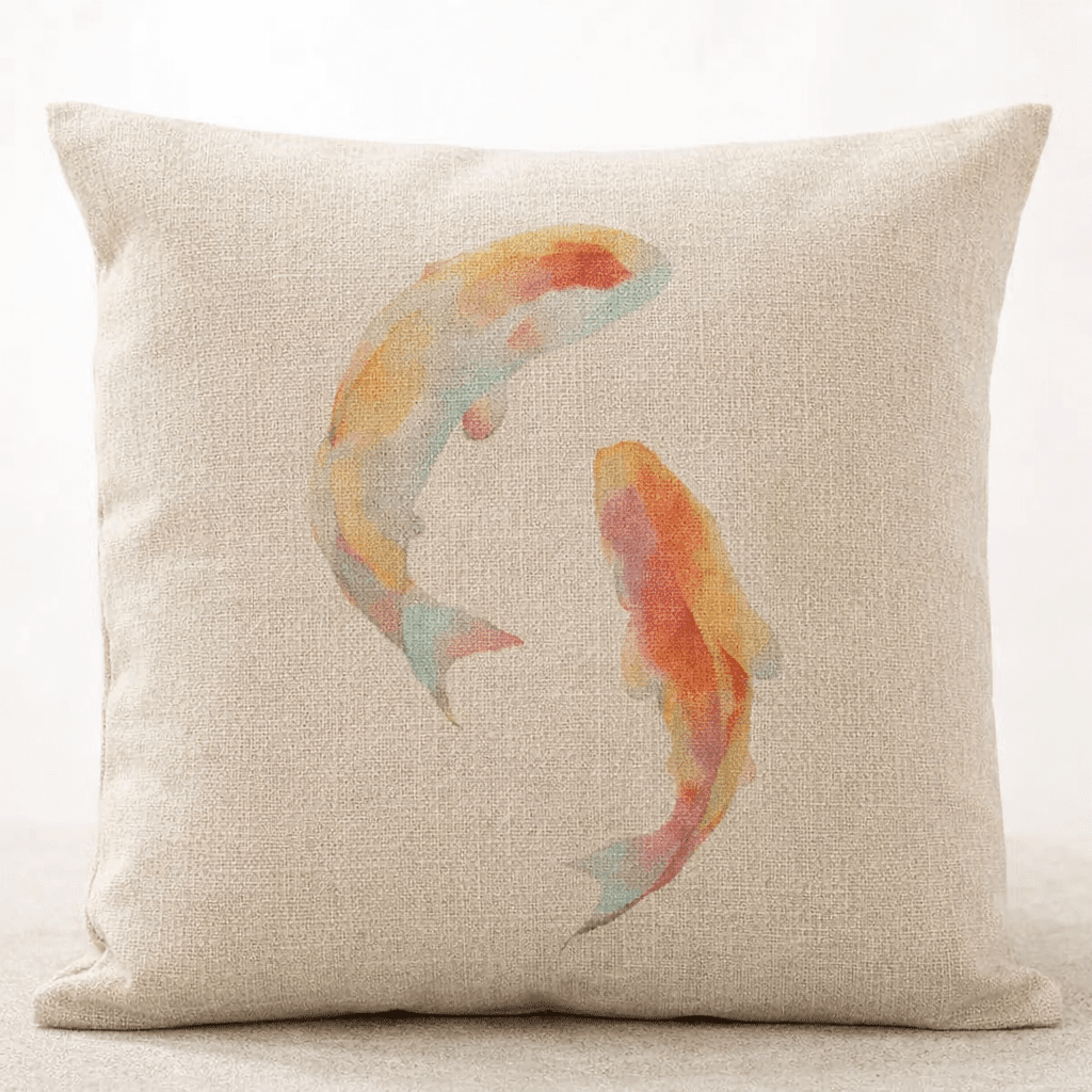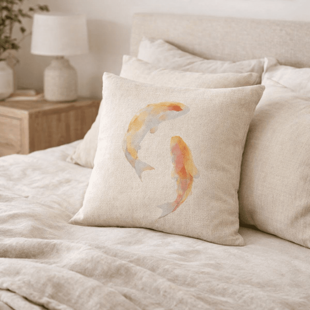 Dekoratívny vankúš s motívom maľovaných rybiek pôsobí jemne a prirodzene. Vďaka svetlému podkladu a textúre pripomínajúcej ľan sa hodí do moderných aj útulných interiérov, kde doplní sedačku, kreslo alebo posteľ.