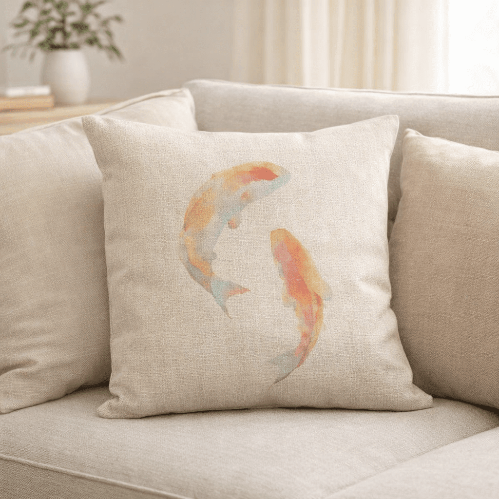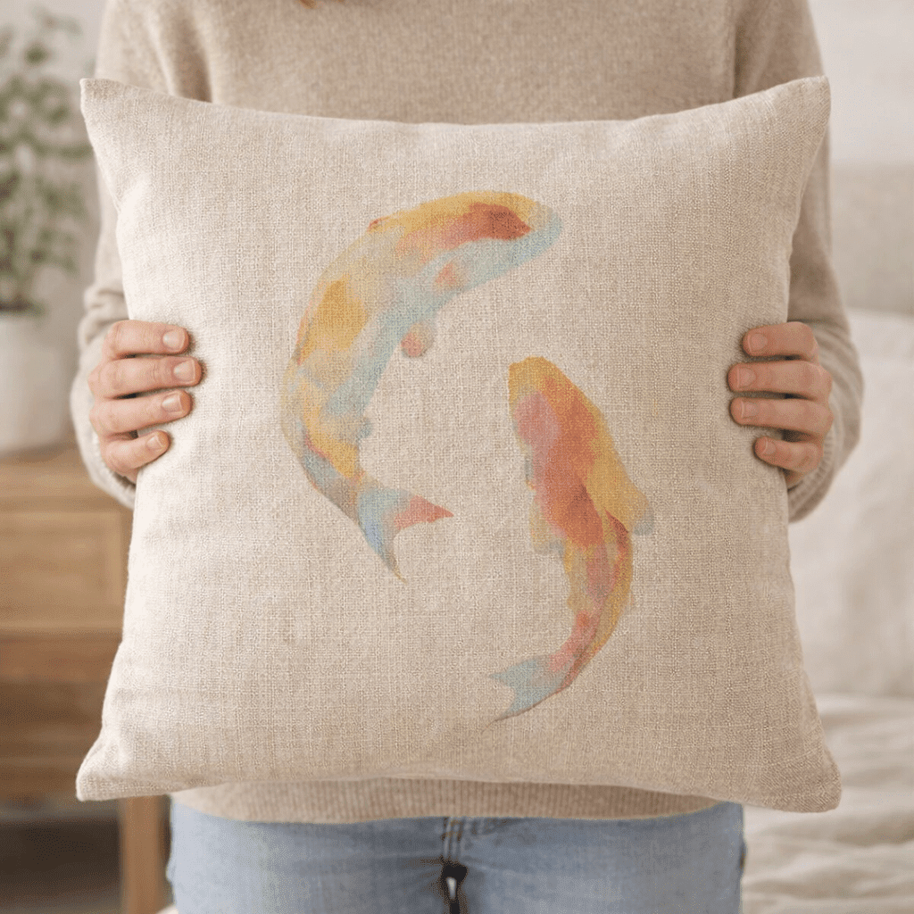 Motív akvarelových rybiek dodáva vankúšu ľahký umelecký charakter bez toho, aby pôsobil rušivo. Je vhodný ako nenápadný dekoratívny prvok, ktorý oživí priestor a zároveň zachová pokojný vzhľad miestnosti.