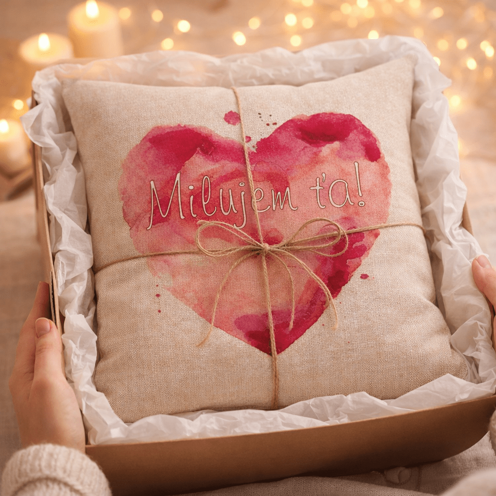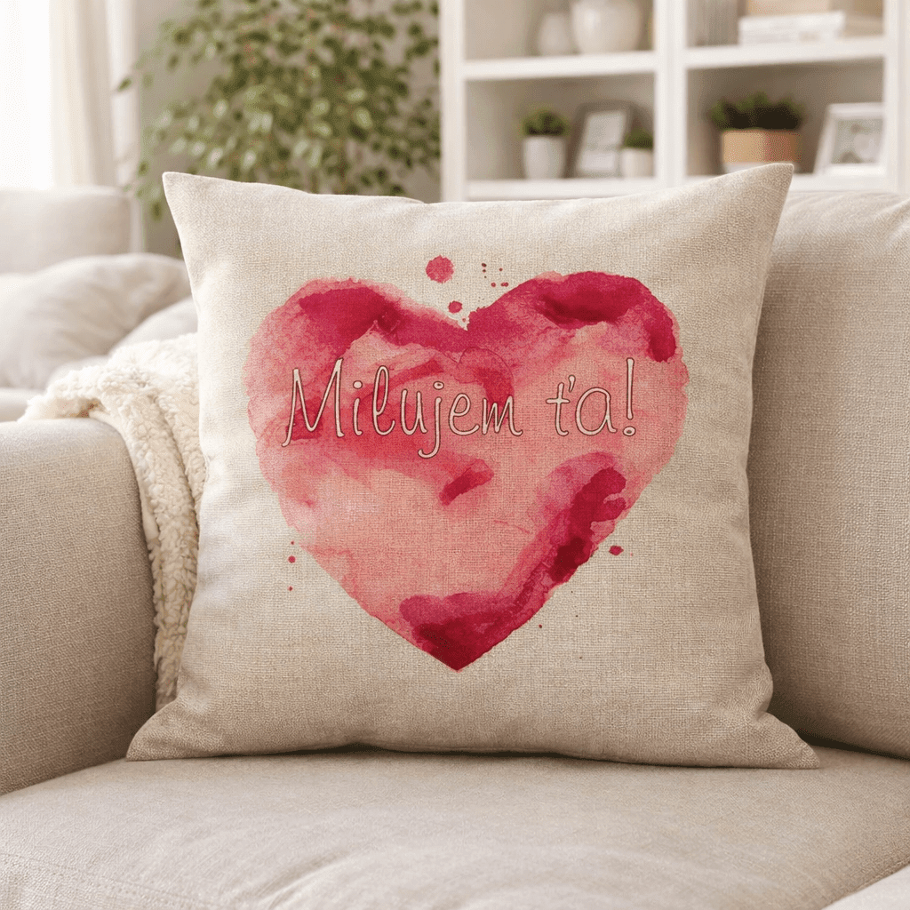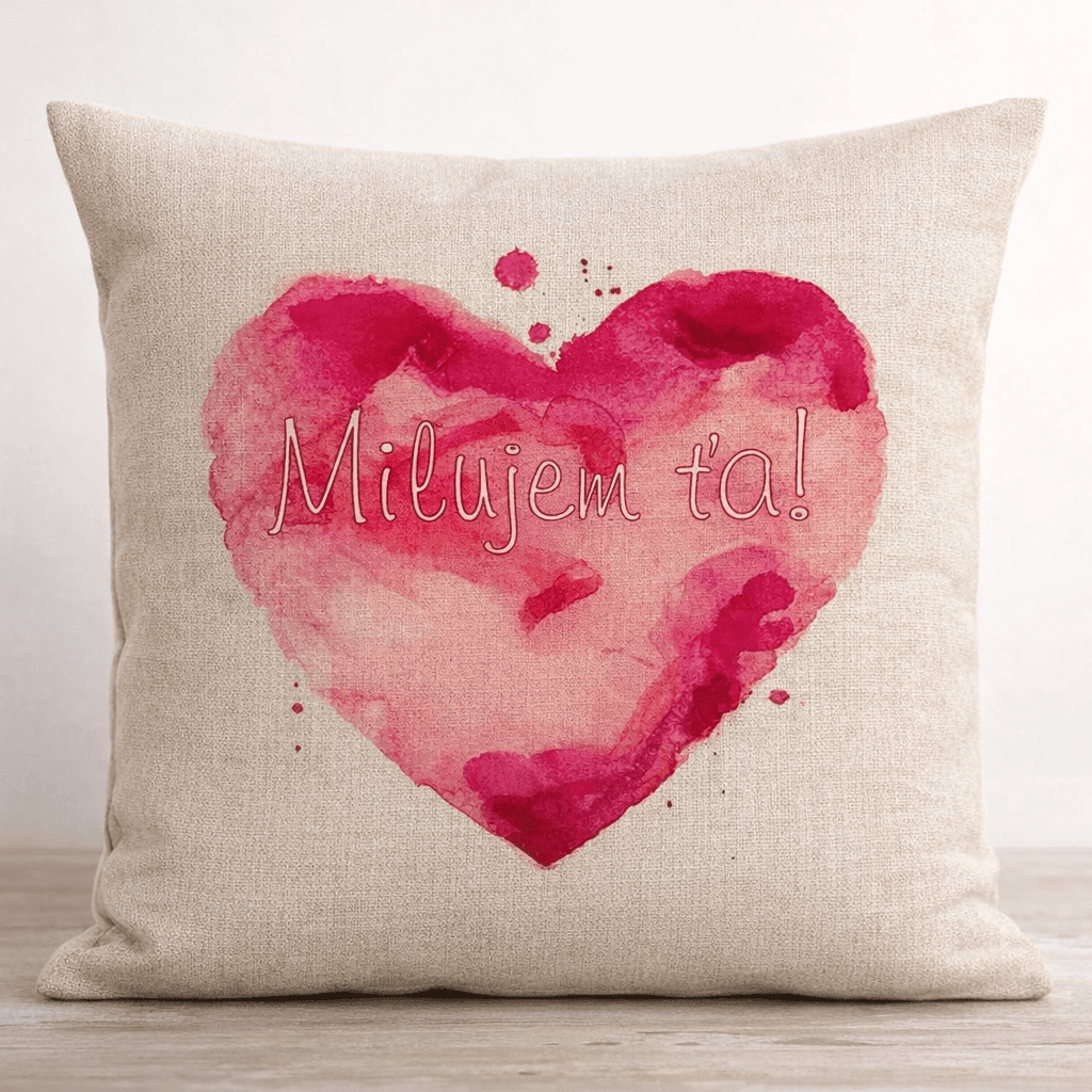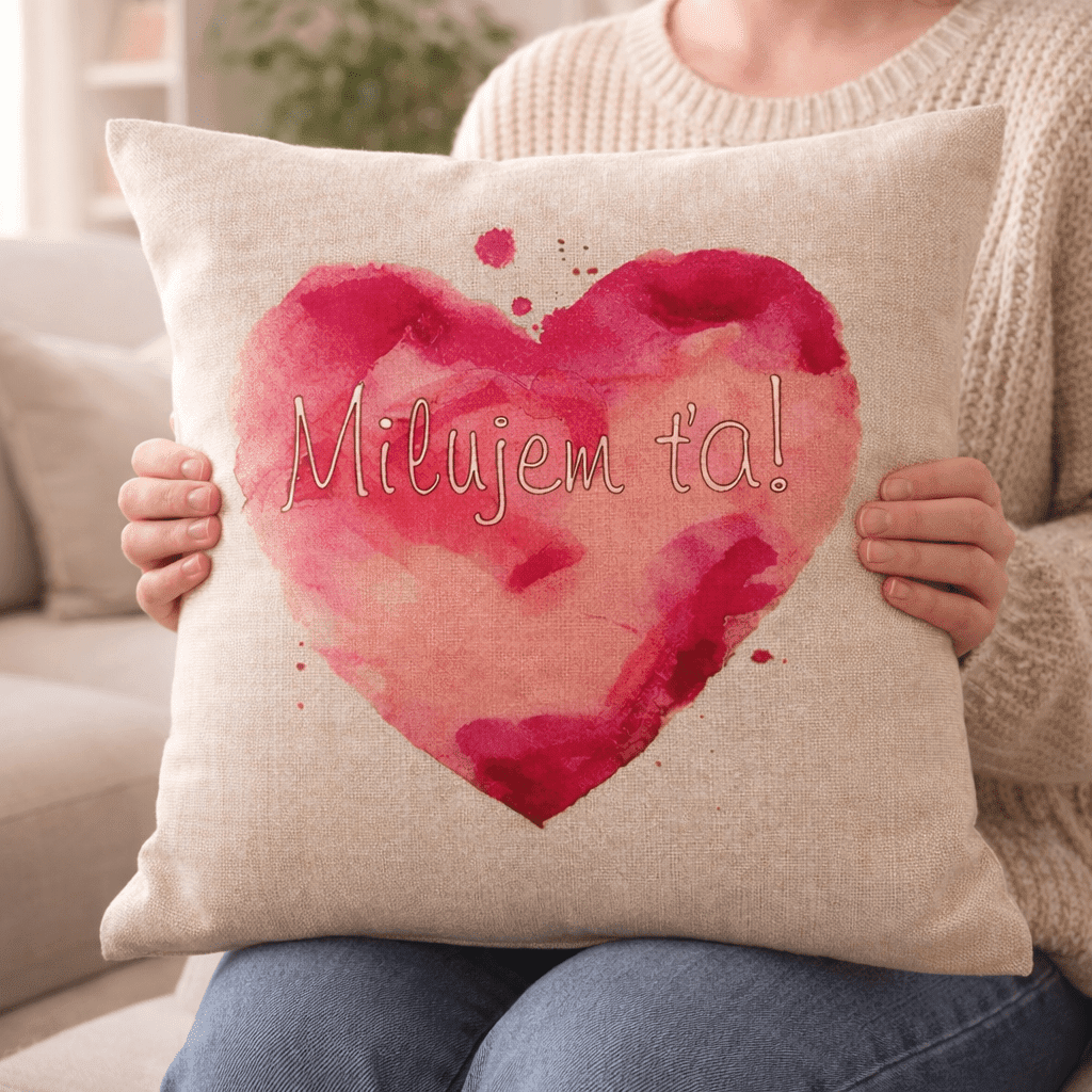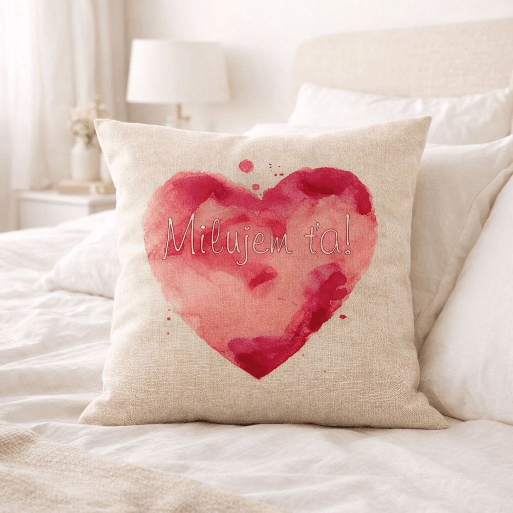 Dekoratívny vankúš „Milujem ťa“ je jednoduchý spôsob, ako do interiéru priniesť osobný a príjemný detail. Motív červeného srdca v akvarelovom štýle dopĺňa jemný text, ktorý pôsobí nenápadne, no zároveň výrazne.
