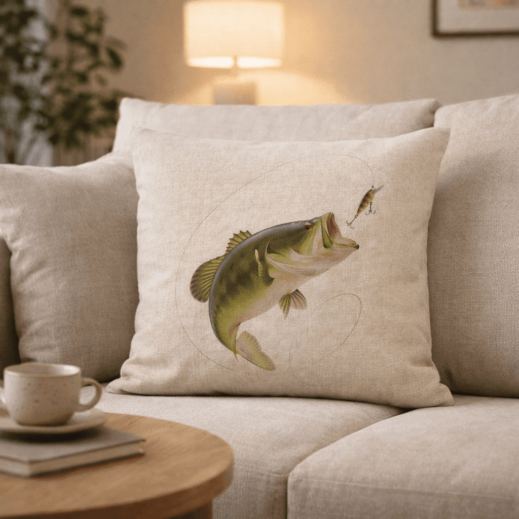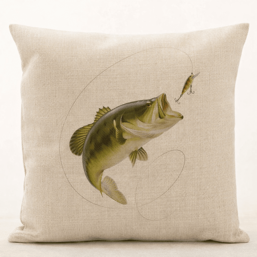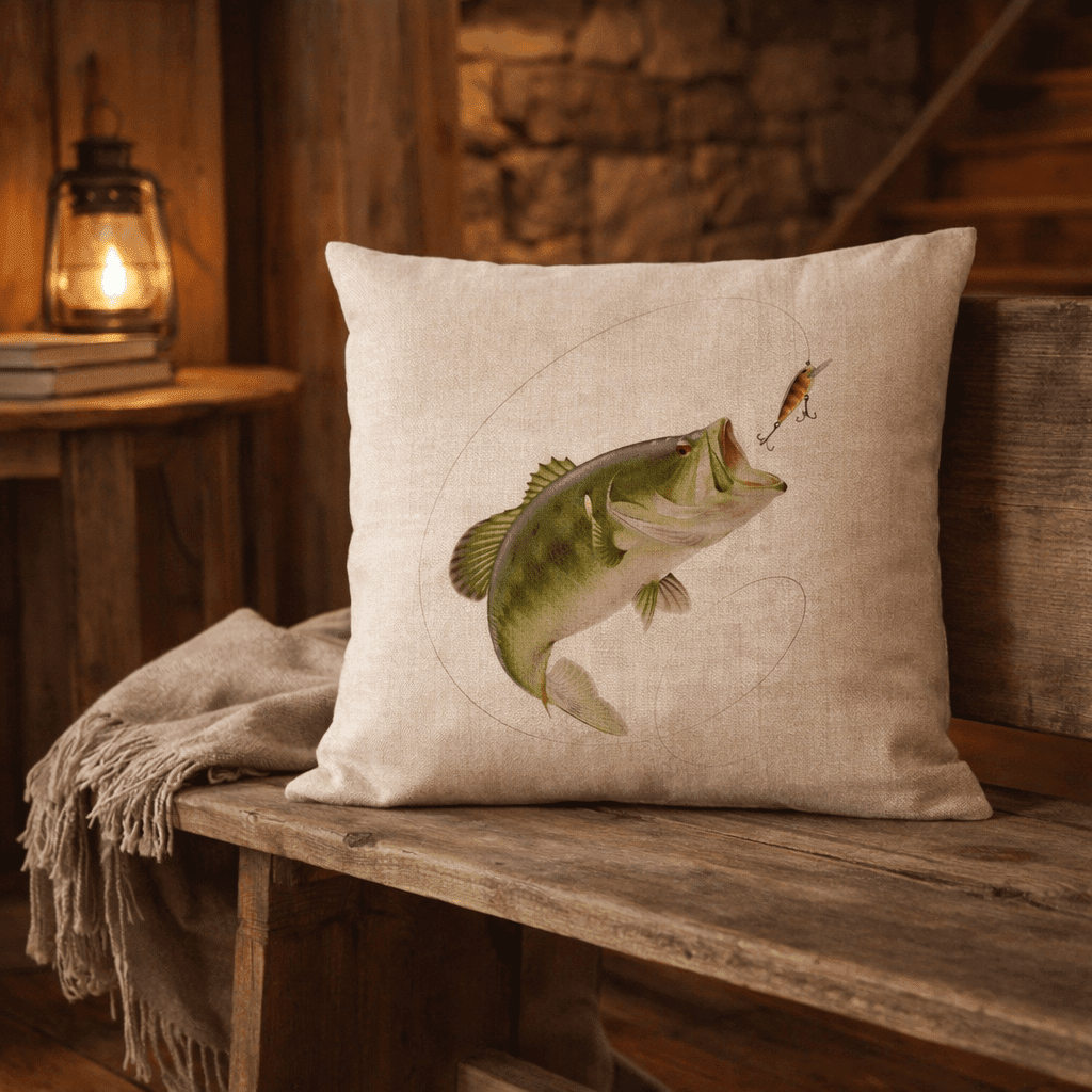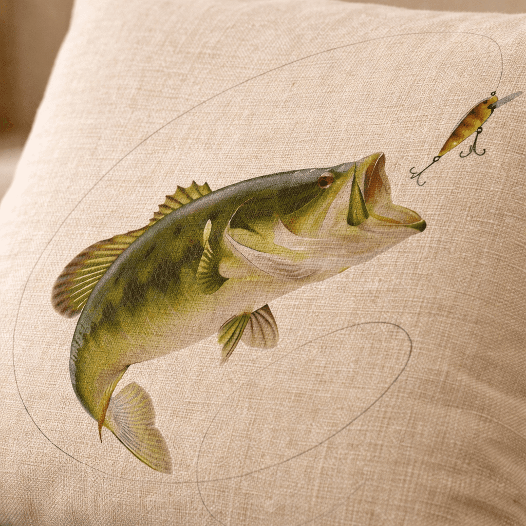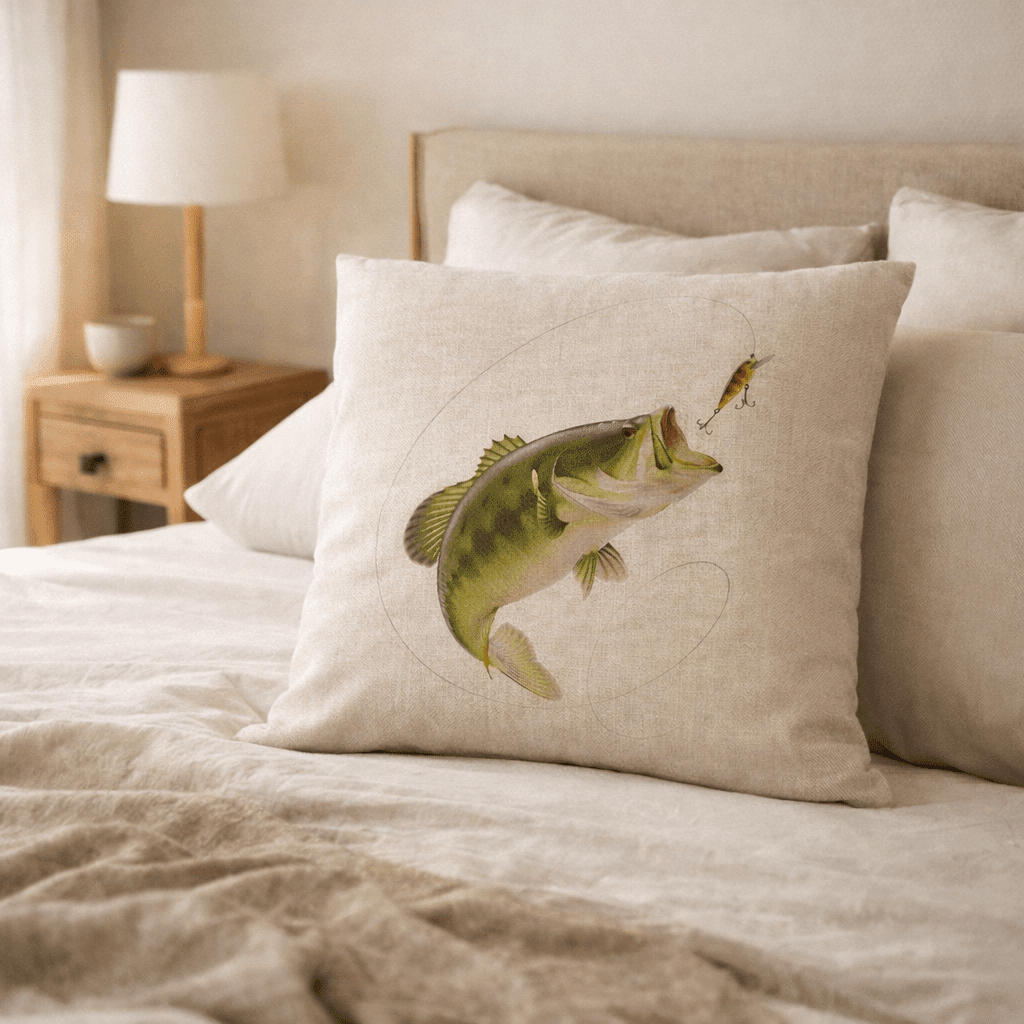 Motív ryby je spracovaný detailne a realisticky, doplnený o jemný náznak rybárskeho vlasca a nástrahy. Vankúš tak nepôsobí rušivo, ale skôr ako decentná dekorácia s osobitým charakterom.