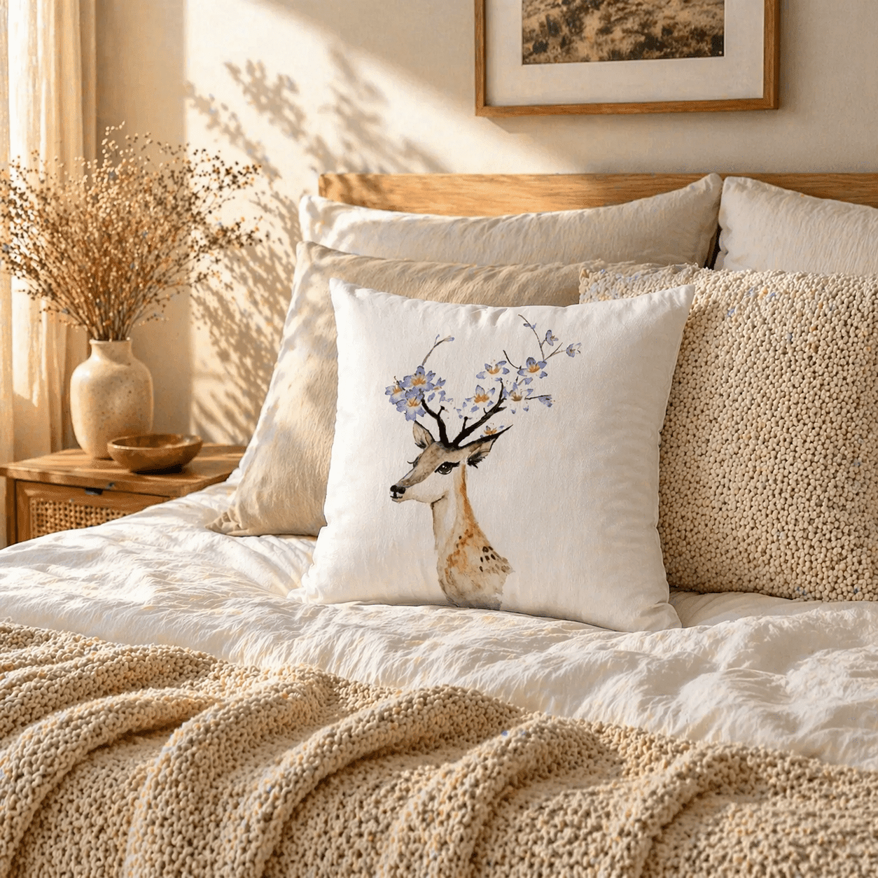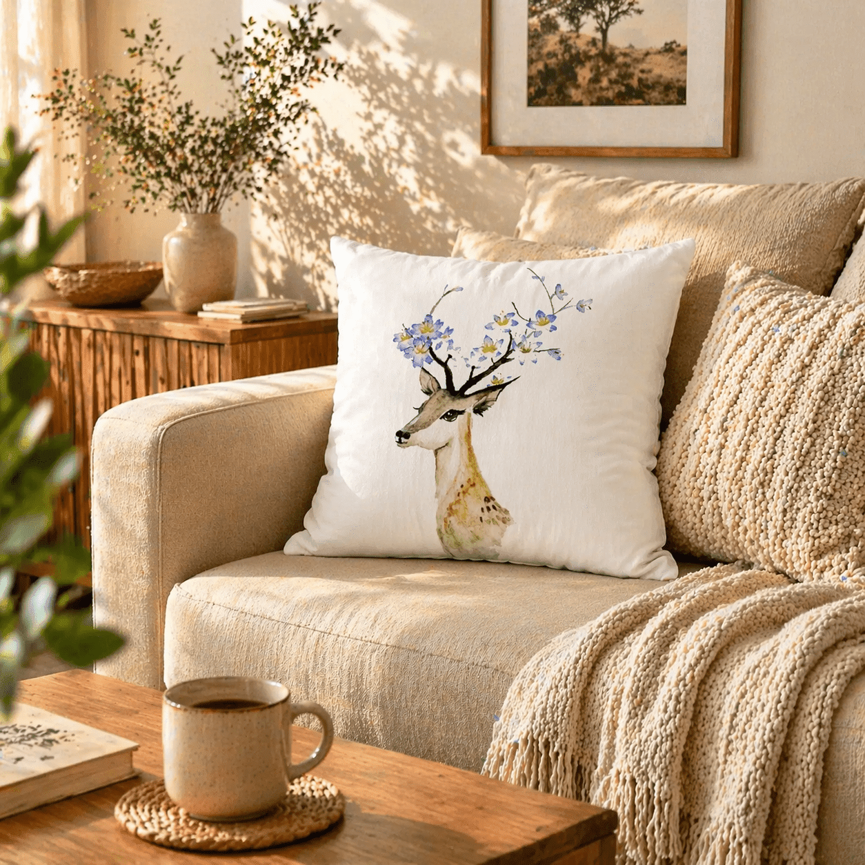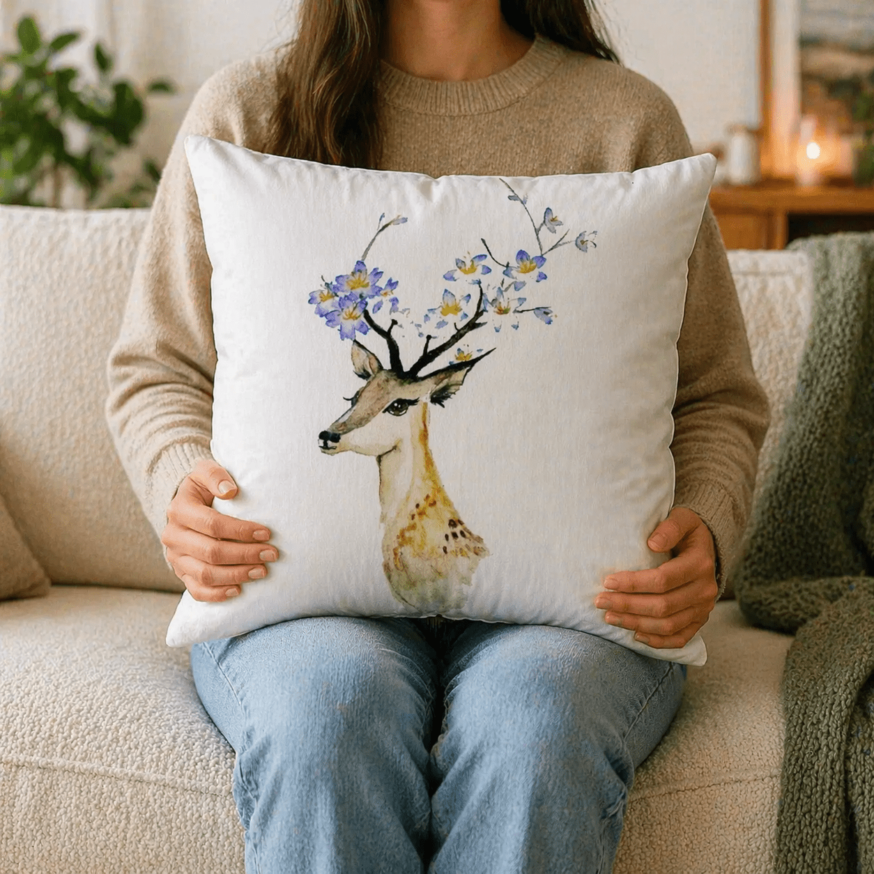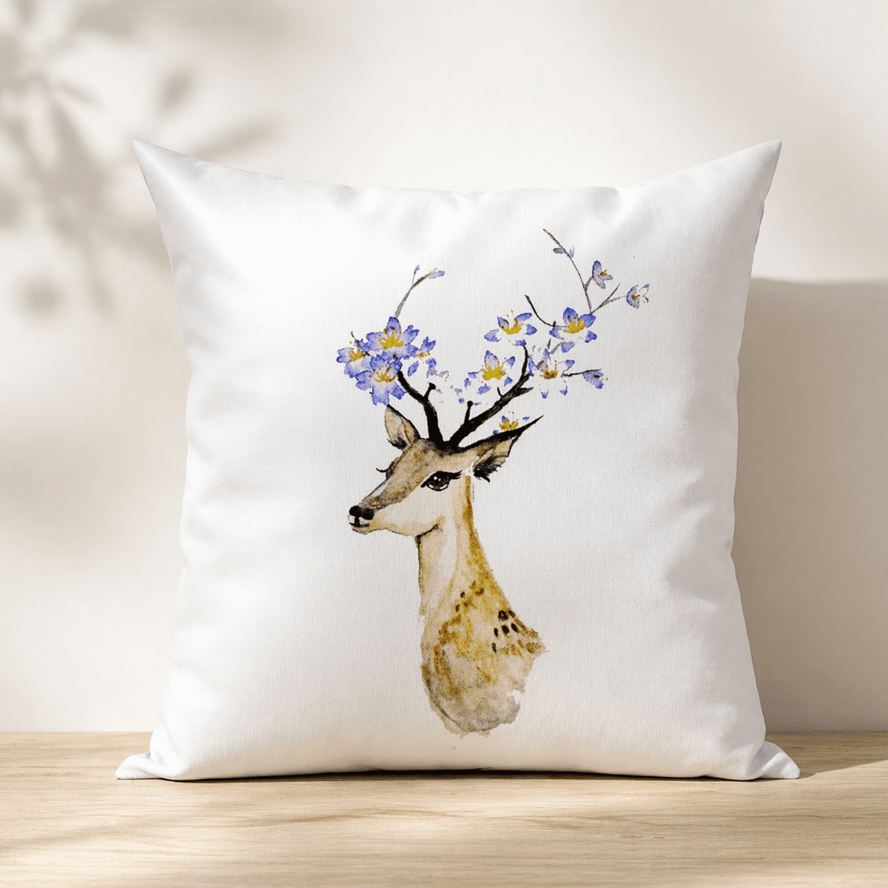 Dekoračný vankúš so srnkou a kvetmi pôsobí jemne, pokojne a prirodzene. Motív akvarelovej ilustrácie srnky s rozkvitnutými vetvičkami vytvára príjemnú atmosféru a ľahko zapadne do svetlých aj prírodne ladených interiérov.